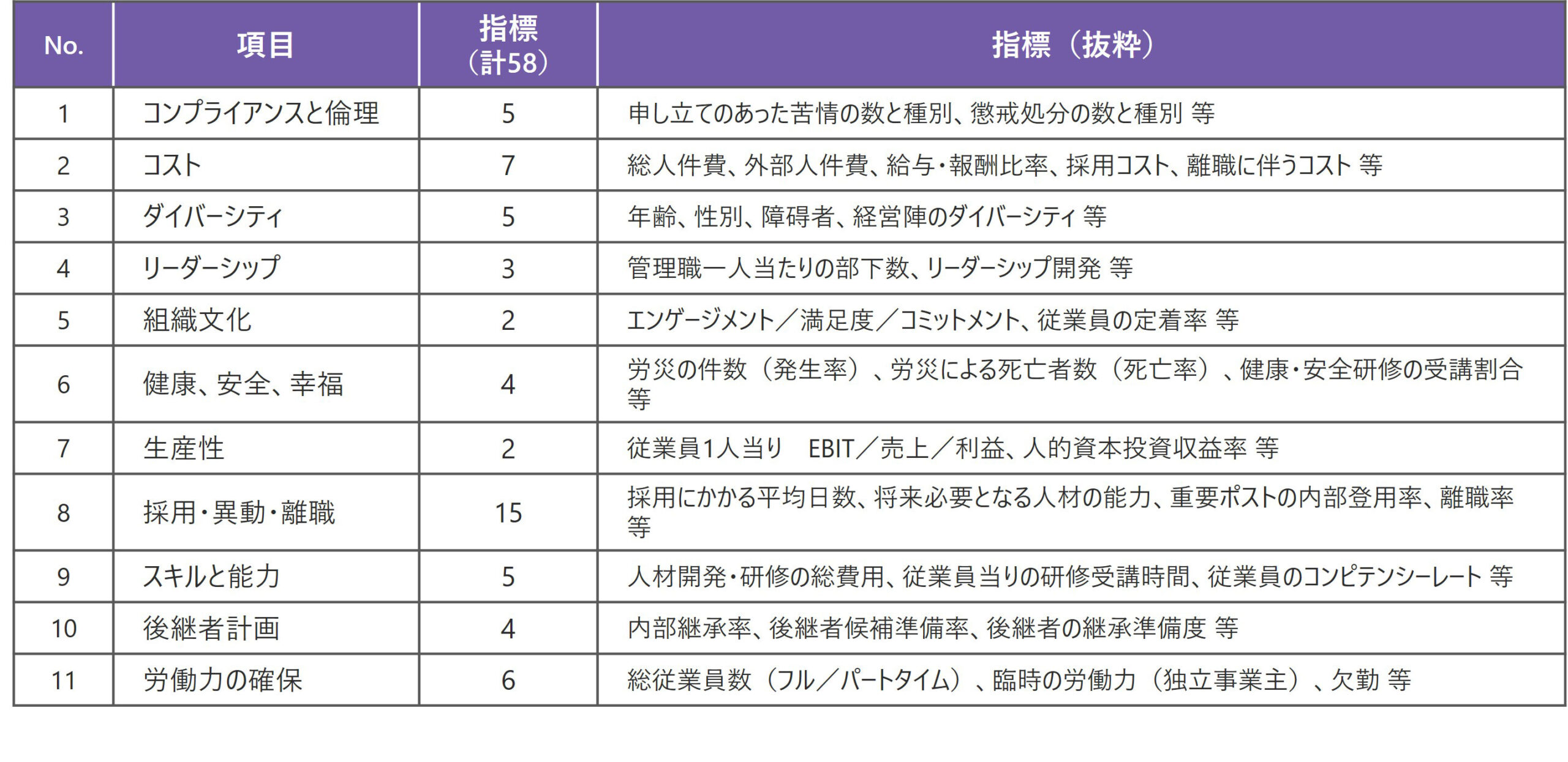 ISO30414では以下の通り11項目58指標が開示項目として挙げられている。各指標がバランスよく設定されており、基準として参照するのにふさわしい内容となっている。