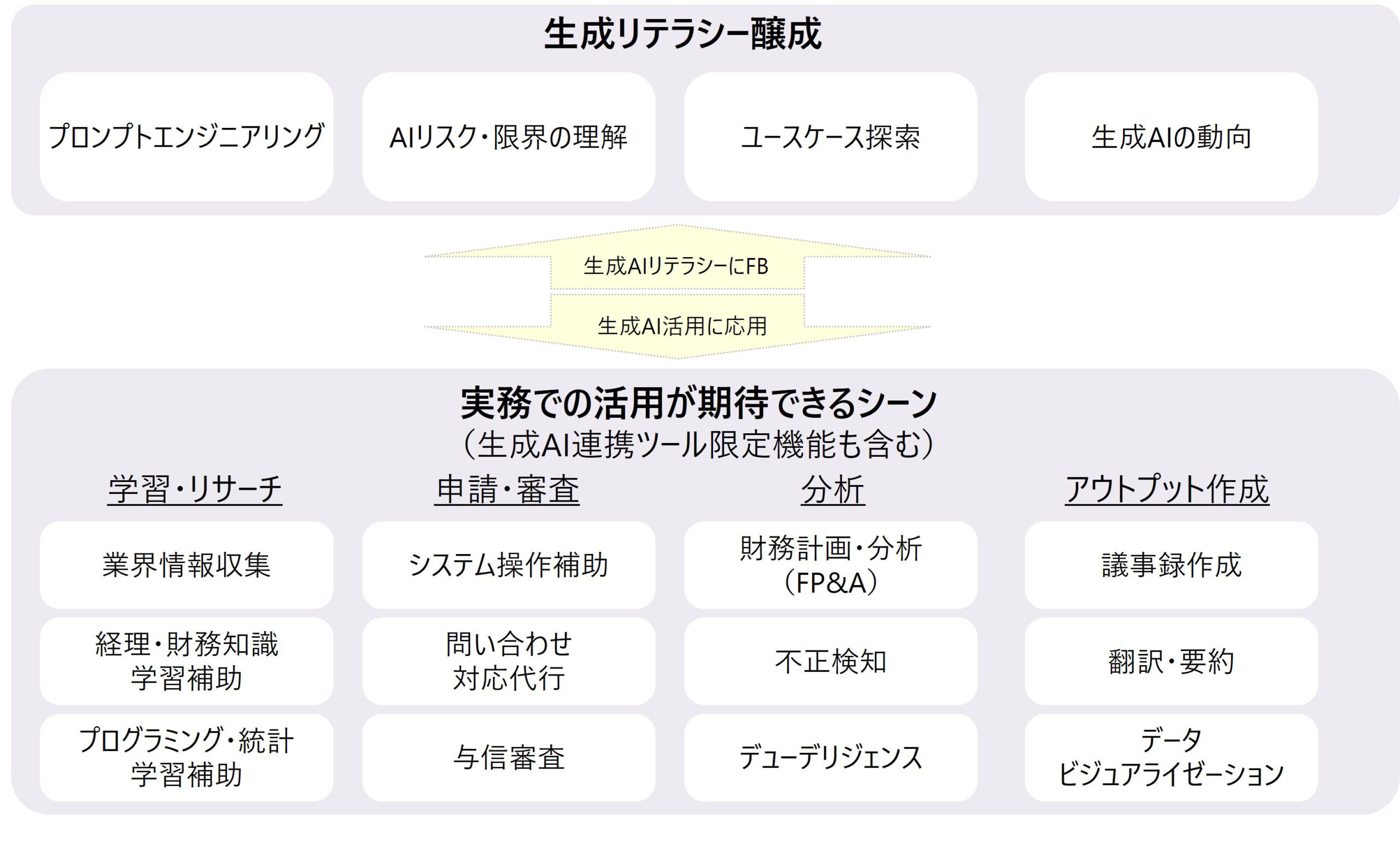 この文脈で重要になるのは、各組織や人が「生成AIリテラシー」を速やかかつ体系的に習得することだ。実務において生成AIを導入し、理論と実践を組み合わせて学び、習得することが不可欠である。そして、その過程で得た知識や経験を組織として独自の「生成AIリテラシー」として体系化し、更に共有・実務へ還元することで、生成AI時代に即応できる組織づくり、人材育成が可能になると筆者は考えている。