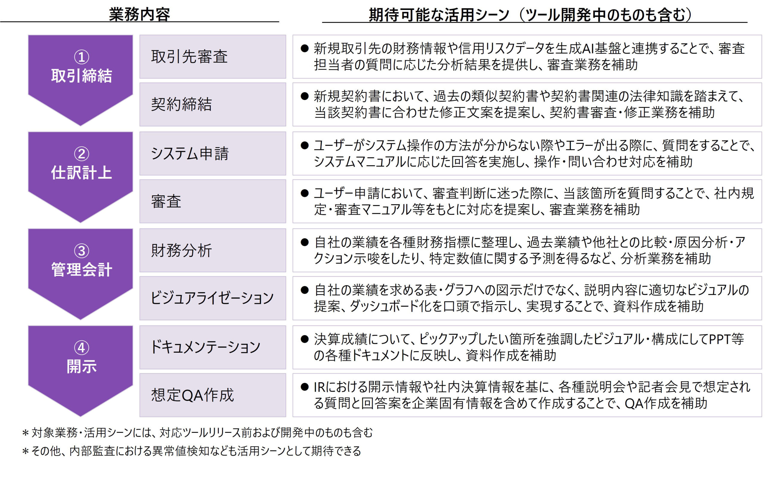 実際に開発中のものを含め、各業務プロセスのうち生成AIを活用できるシーンを整理すると、下図の通りである。