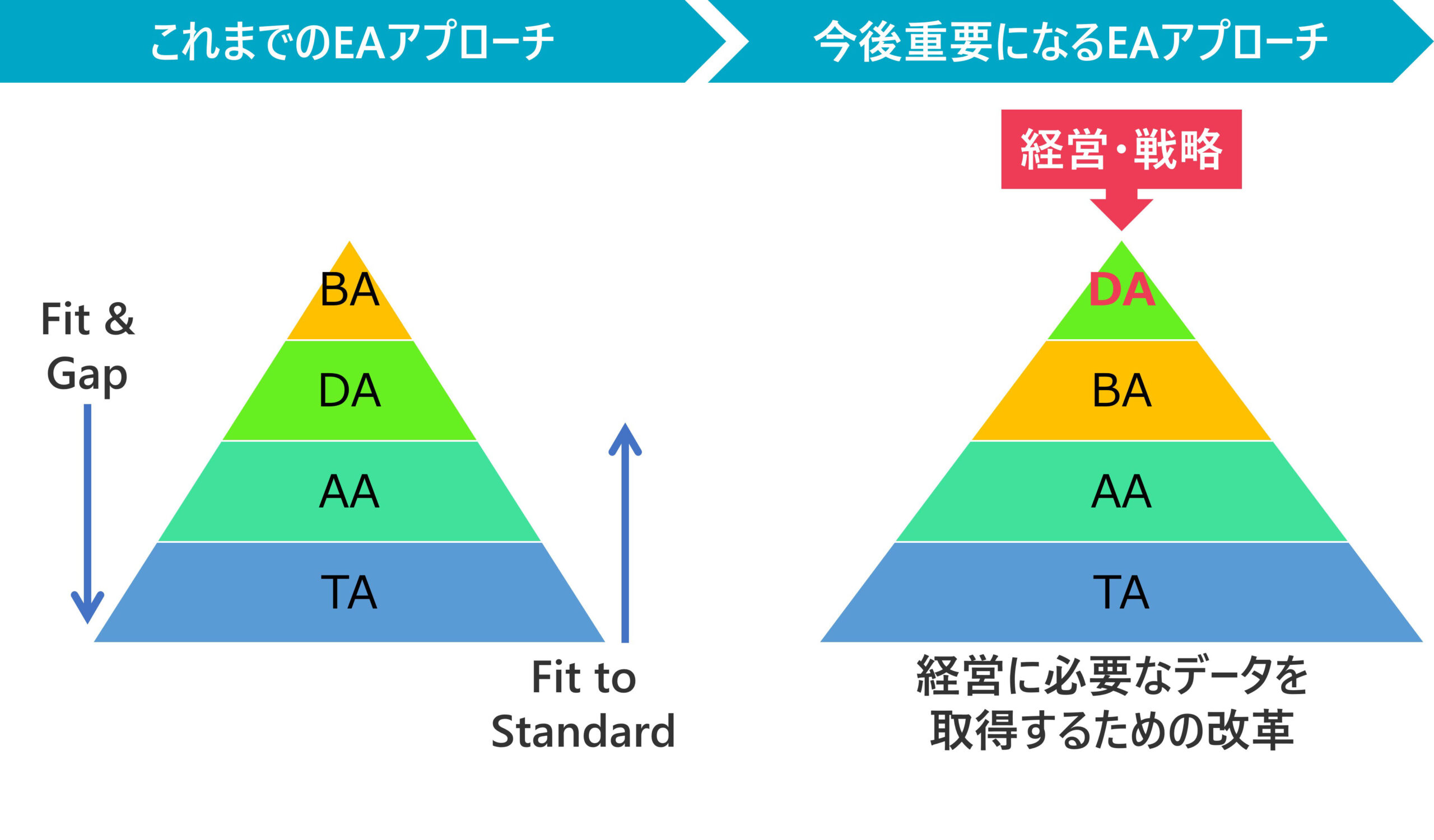 どちらも業務改革・システム改革の手段の1つだが、注目すべきはDAの位置付けである。どちらのアプローチを採用しても、データは従属的に決まることになっている。データを中心に据えた改革のはずなのに、データが従属的に決まるということに違和感がないだろうか。