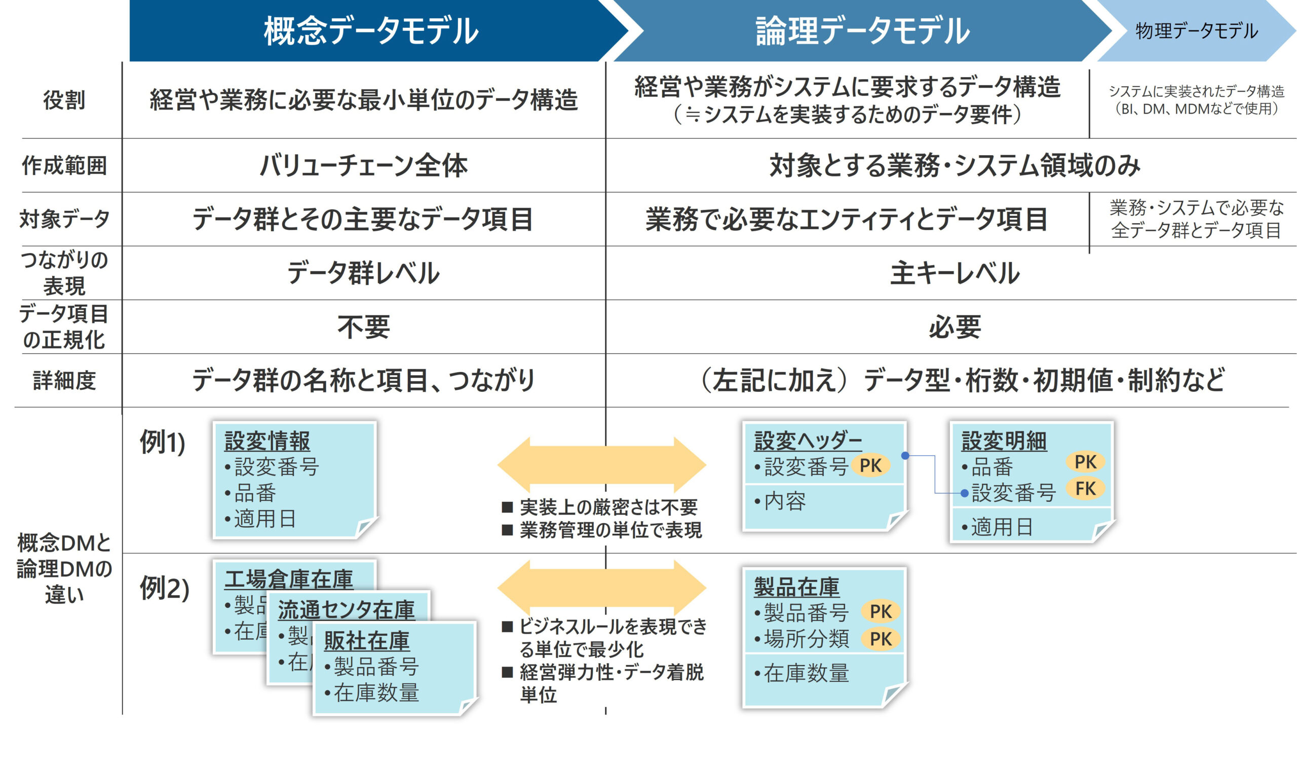 これらに対応した考え方が概念データモデルだ。論理データモデルや物理データモデルと比較して、抽象度が高いため理解しづらい考え方ではある。しかし自社の成り立ちをデータで表現し、経営戦略や世の中の変化をデータモデルに取り込むという考え方は、業務やシステムが細分化され、それぞれが爆発的なスピードで変化する環境下において有効なアプローチであると考えている。