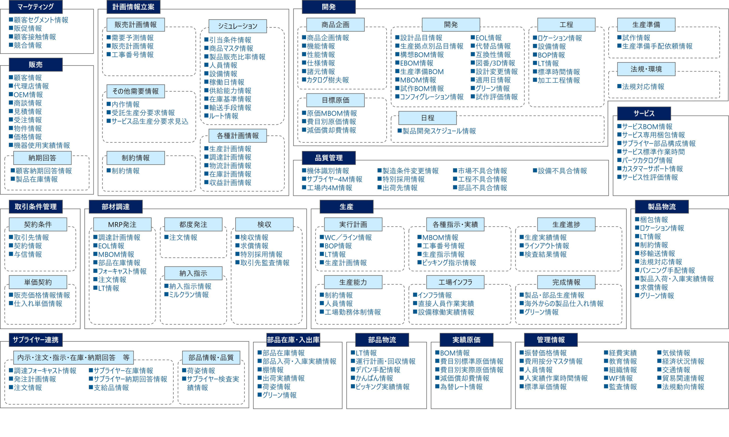 ここで、筆者らが作った概念データモデルを紹介したい(図3)。ご覧いただくとわかる通り、概念と言いながらも非常に細かい内容になっている。製造業のバリューチェーン全体をモデル化しているため、データ群だけでこの図のようになる。
