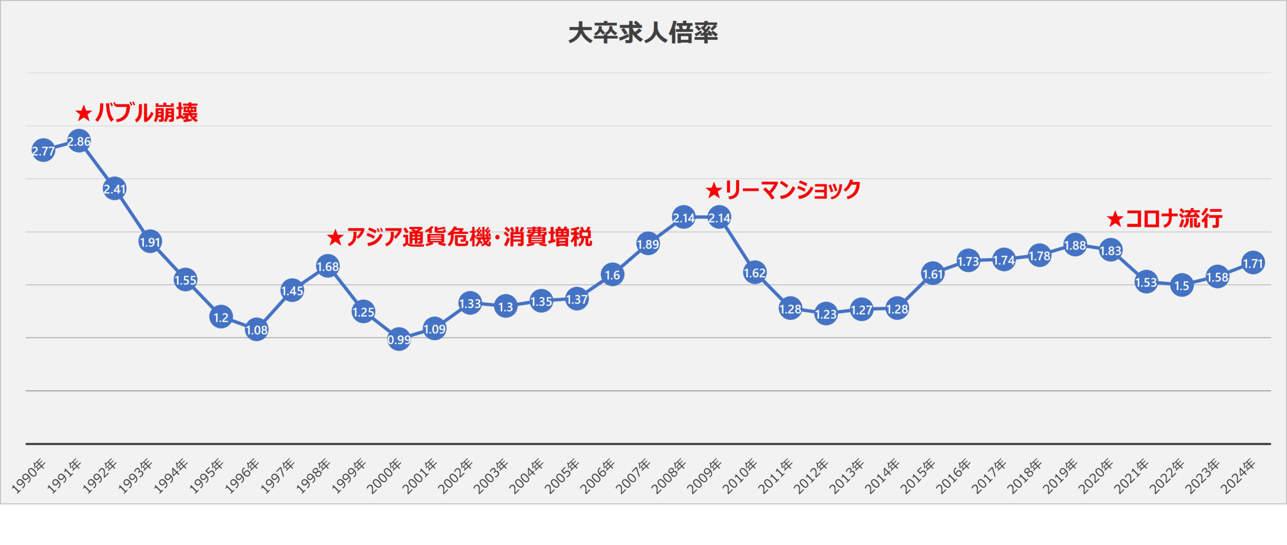 - 出典:リクルートワークス研究所「大卒求人倍率調査」を基に当社作成[1]
