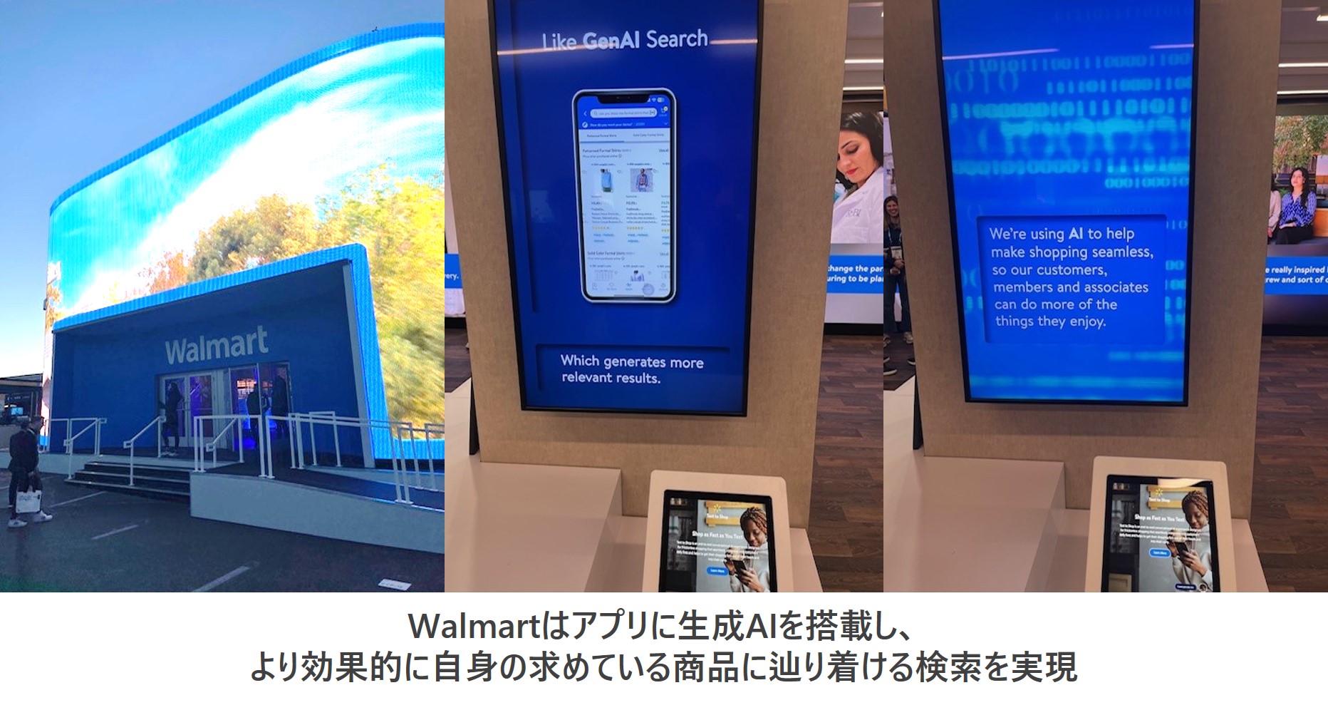 例えばGoogleは生成AIを活用し、Android端末でオリジナルの壁紙を作成できるサービスを紹介していた。また、Walmartは自社のアプリに生成AIの「GenAI」を組み込むことでユーザーの検索の補助を行い、ユーザー体験を向上させ、売り上げの拡大を目指している。これまでの検索機能では、スナック菓子などのカテゴリーや商品名を入れて検索するのが一般的であるが、この検索機能では、「スポーツ観戦」などと検索することで、スポーツ観戦する際にあると良さそうなもの(例えばポテトチップス、清涼飲料、大型テレビ等)を検索結果として表示する。つまりユーザーが想起していなかったものまで検索できることで、効率的な検索と購買機会の拡大が実現するというわけだ。