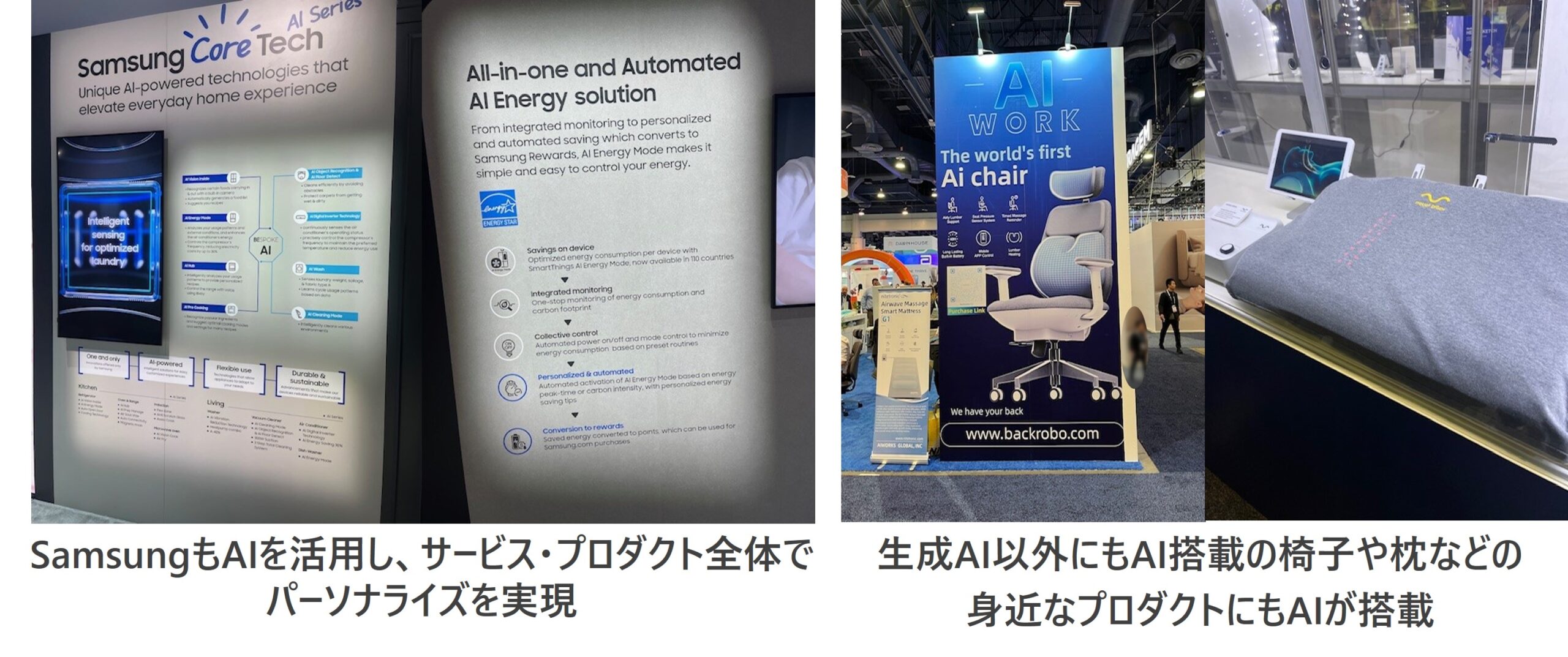 また生成AI以外にも、多くの企業でAIの活用が進んでおり、SamsungのAI搭載のスマートホームでは料理の際に利用している電力の消費量や何時ごろ帰宅して電気をつけるか、好みの冷房温度など生活に関するユーザーデータを広く収集し活用することでAIがユーザーの生活に最適化された住環境を自動で提供することと、より効率的なエネルギー使用の両方を実現していた。加えて、AI搭載の椅子や枕など、より身近なプロダクトを扱うような会社もAIを導入しており、生成AIを含むAIのテクノロジー全般が我々の生活の質・利便性の向上に良い影響を与えることを想像できる。