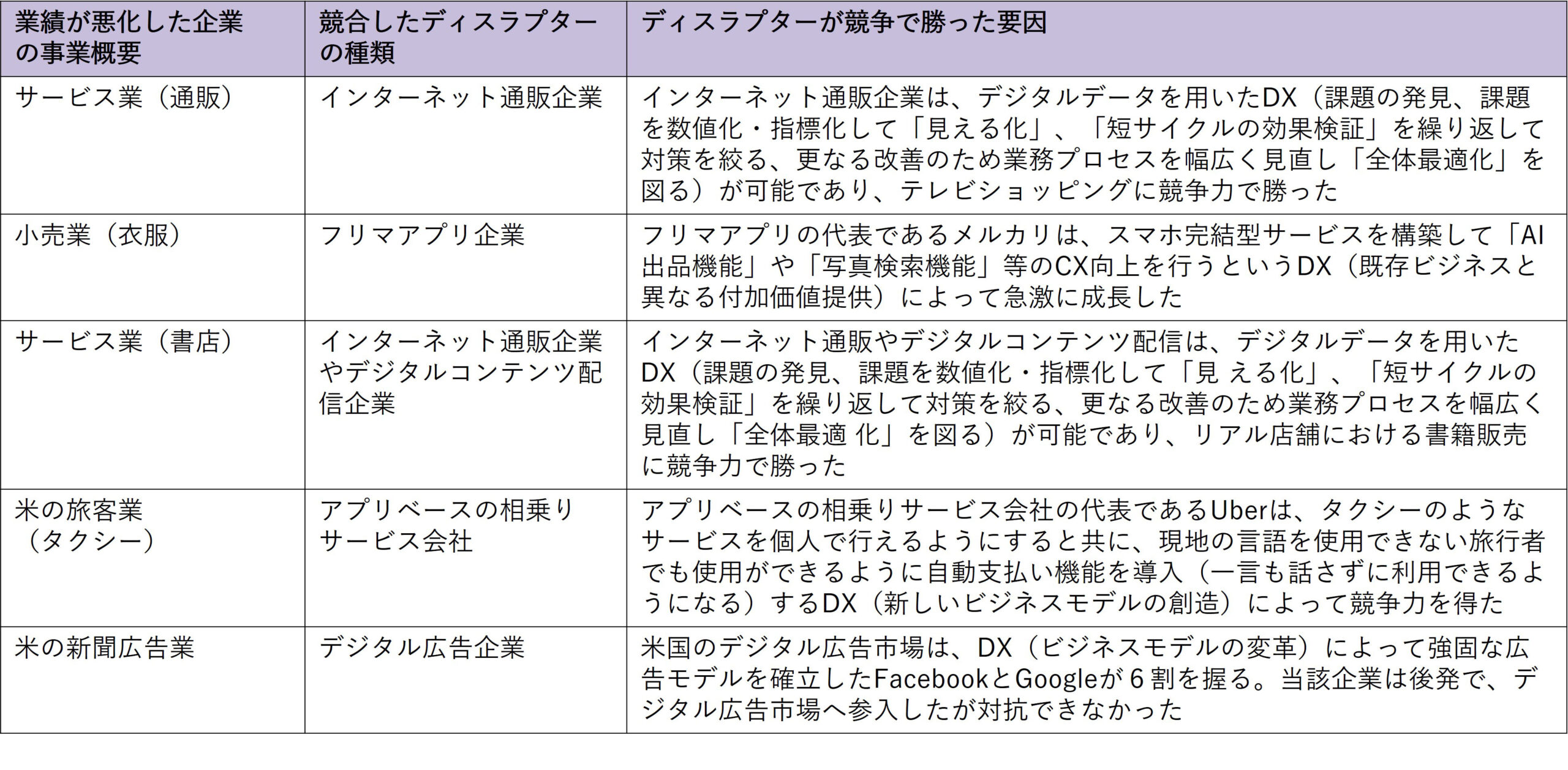 環境が急速かつ複雑に変化するなかで、デジタル技術を武器に様々な市場へと参入するディスラプター(破壊者)の勃興も見られた(表)。