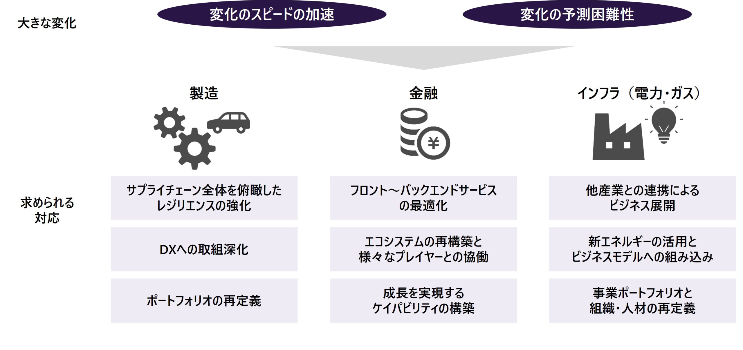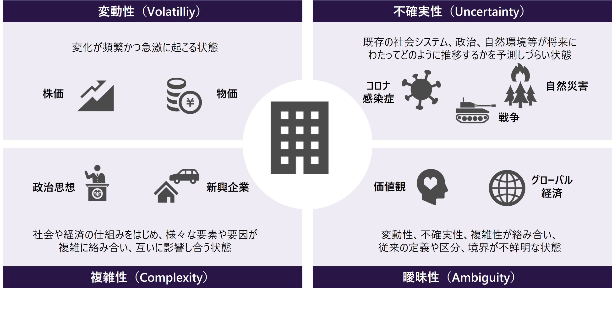 「社会の複雑さや不確実性が増している」と言われて久しく、企業各社は変化への対応を模索している。他方、それら変化の様相や企業への影響、方法論に関する情報はあまり明示されていないのが現状である。