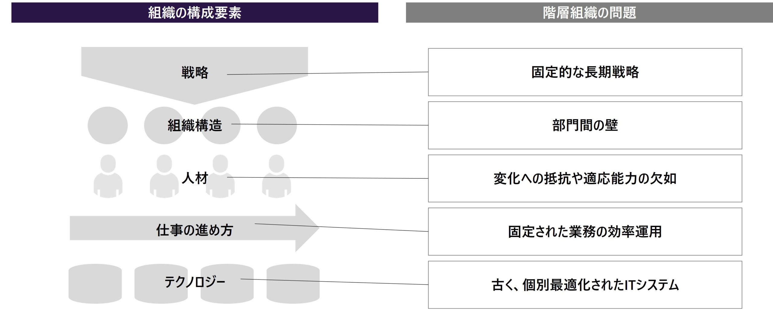 多くの企業は、内外環境の急速な変化に対応することが難しい。その原因は、多くの企業が採用している「階層組織」にある。組織を構成する「戦略」「組織構造」「人材」「仕事の進め方」「テクノロジー」の5つの観点から、その詳細な原因を説明しよう(図3)。