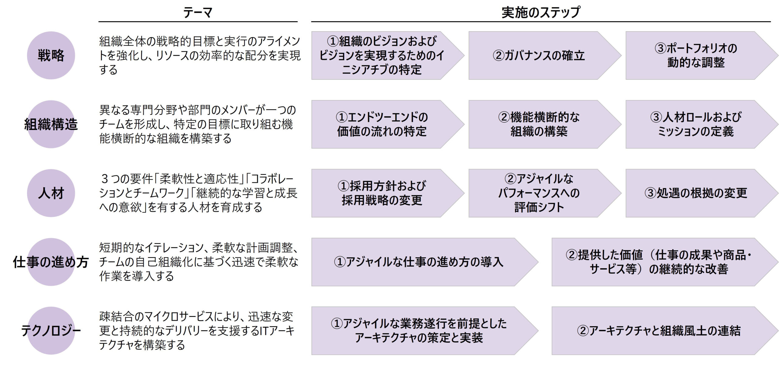 では、どのようにアジャイル組織を構築すればよいのか。これまでクニエが支援した実績から明らかになったアジャイル組織の構築方法を、「戦略」「組織構造」「人材」「仕事の進め方」「テクノロジー」の5つの観点から、具体的なステップとともに説明しよう(図5)。
