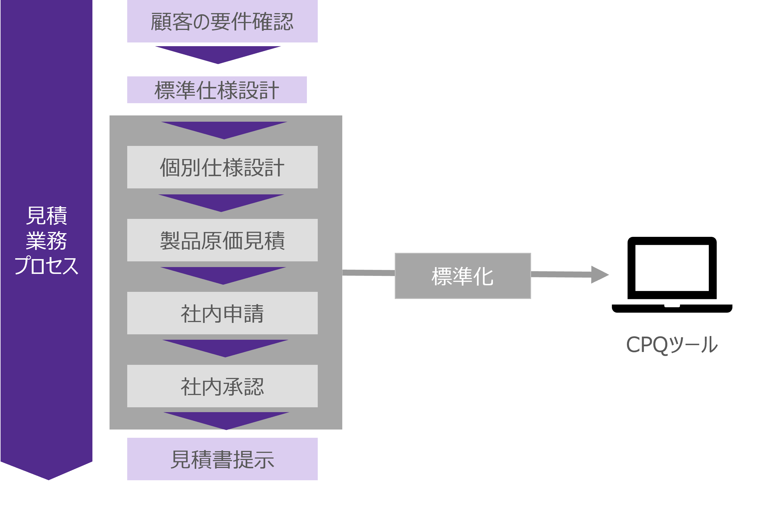見積業務プロセスは、顧客からの見積依頼に応じて標準化仕様による対応範囲の検討、個別仕様検討・設計、製品原価の見積もり、社内申請、社内承認という流れとなっており、個別仕様検討以降の各作業は複数部門が各作業結果をバトンのように受け取る直列的な都度作業ありきのプロセスとなっている。