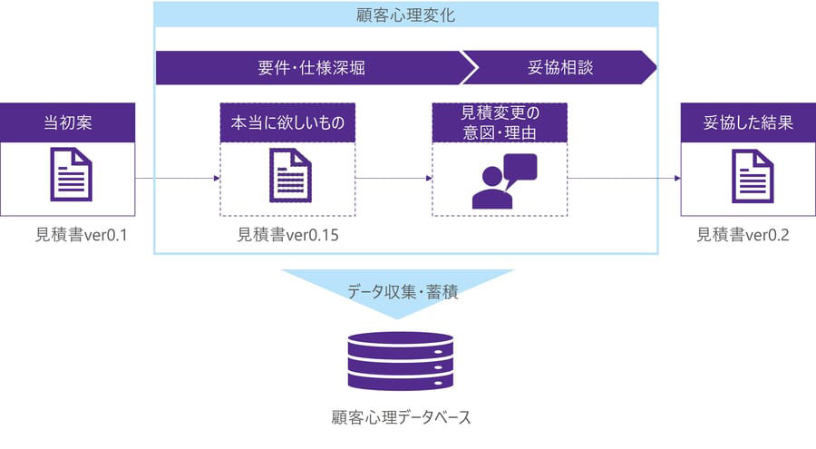 顧客心理の変化は、顧客と営業担当者がやり取りする中で行った画面操作の順番と変更内容(部品の追加/変更、部品の数量変更、仮見積価格などの変遷履歴など)をトラッキングし、見積変更の意図・理由も合わせてデータ化することで収集・蓄積が可能となる。