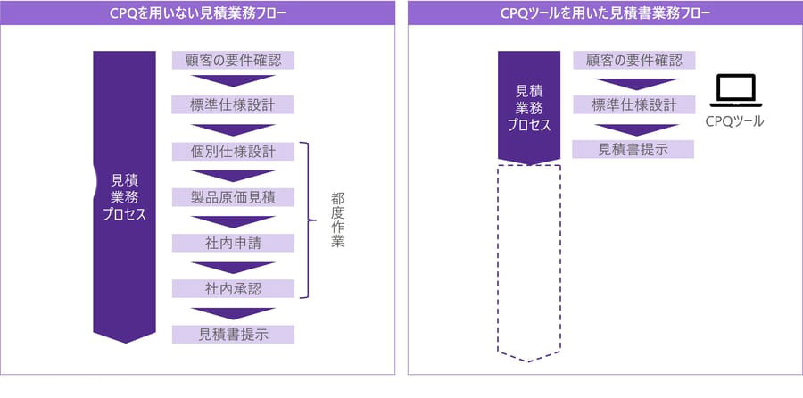CPQツールとは、短納期・リアルタイムでの見積書作成・管理を支援するソリューションの総称で、“Configure:製品を構成する部品情報”、“Price:構成情報に基づく各部品の価格表”、“Quote:見積もり”の頭文字を表している。