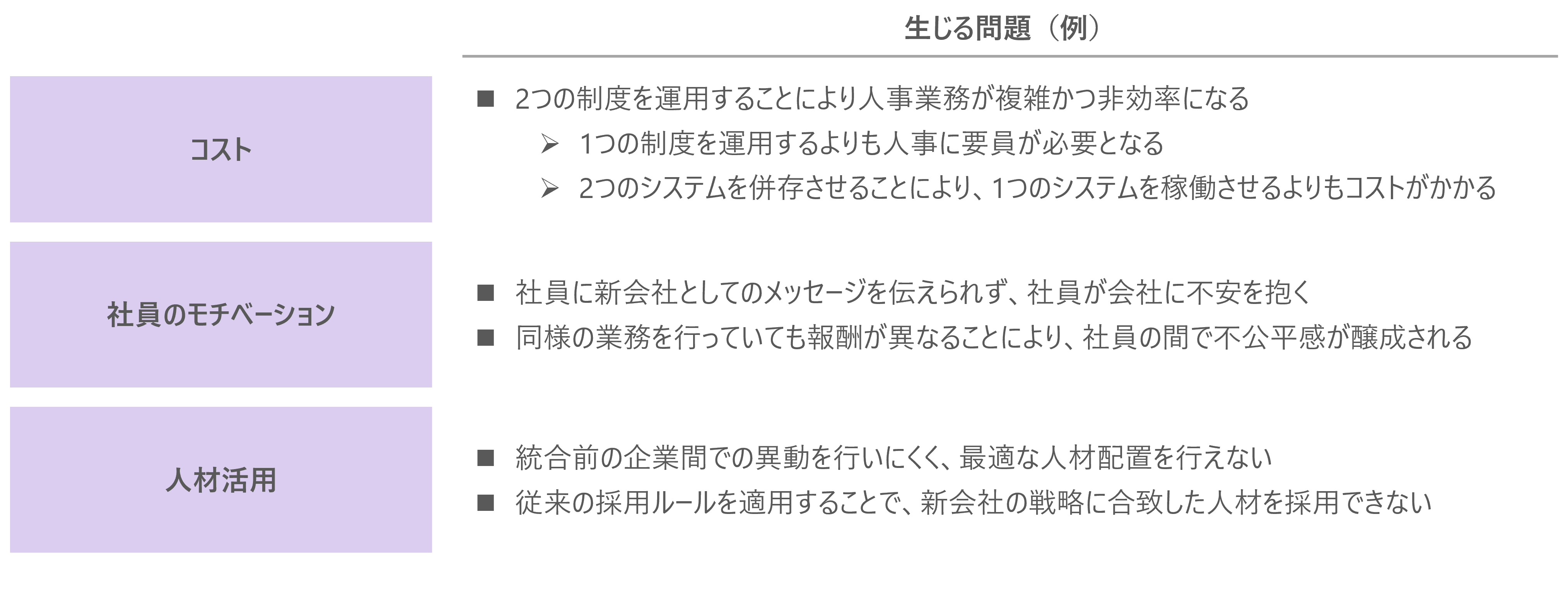 しかし人事制度を統合しない場合、コスト・社員のモチベーション・人材活用の3つの観点でさまざまな問題が生じる可能性がある。システムの併存によるコストの増加や、報酬への不公平感、異動のしづらさなどが例に挙げられる(図2)。