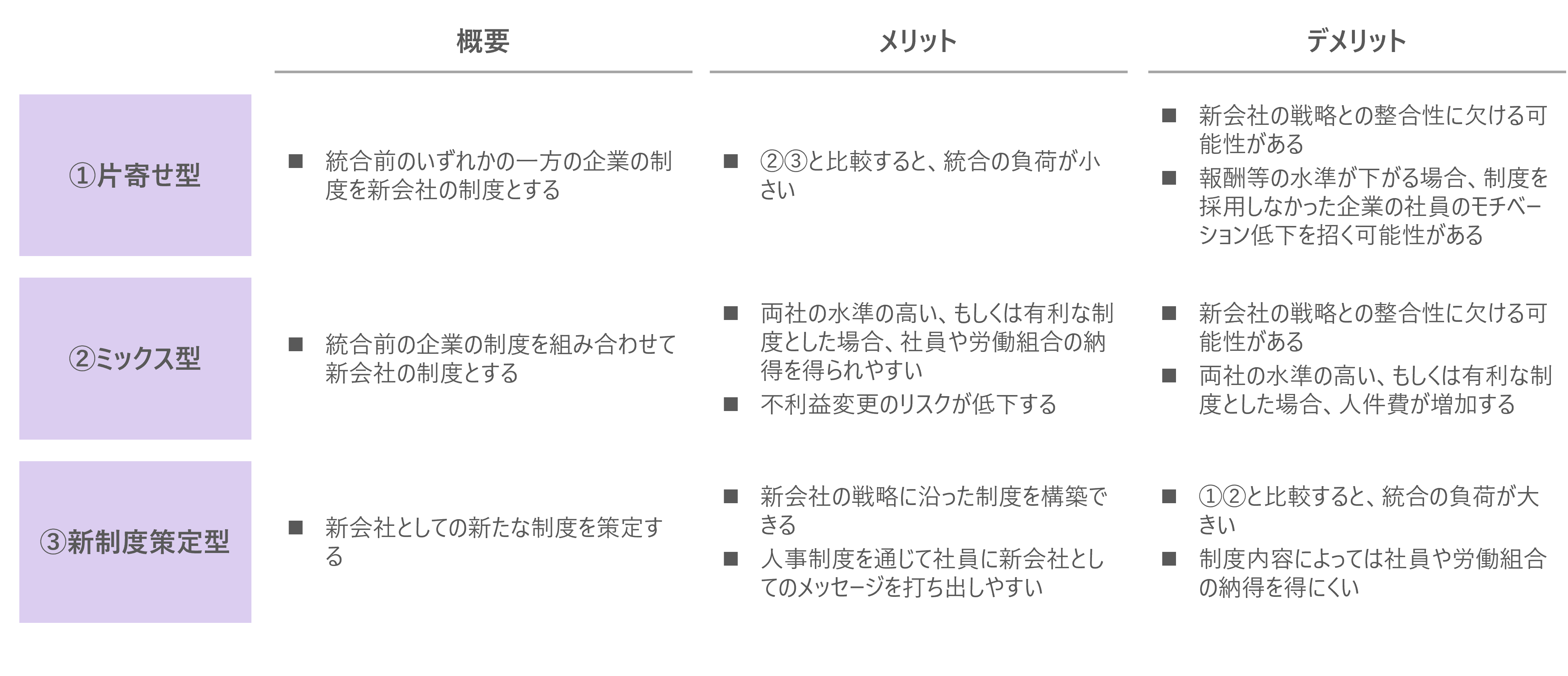これは極端な例ではあるが、単に制度を比較するだけではなく、その制度の背景、定義の意味合い、運用実態等を正しく把握しておく必要がある。なお、制度比較はDD時点で実施している場合も多く、既に実施している場合はその内容を継承し、制度内容を検討するのがよいだろう。いずれのパターンを採る場合においても、既存の制度と両社の制度の差異を把握することで、新会社における制度および移行措置が検討しやすくなる。