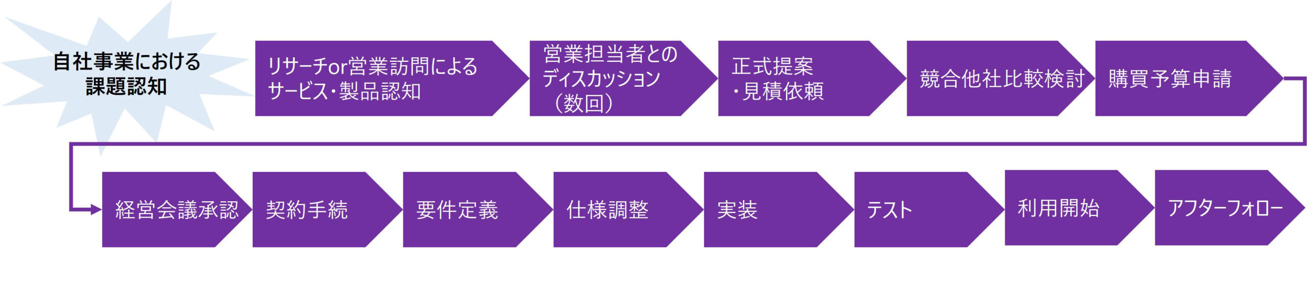 SaaSアプリケーションや定型的な導入ステップが定義されている製品を売り物としている企業を想定する。この場合のカスタマージャーニーのフェーズは、以下のような大まかな流れが想定される。