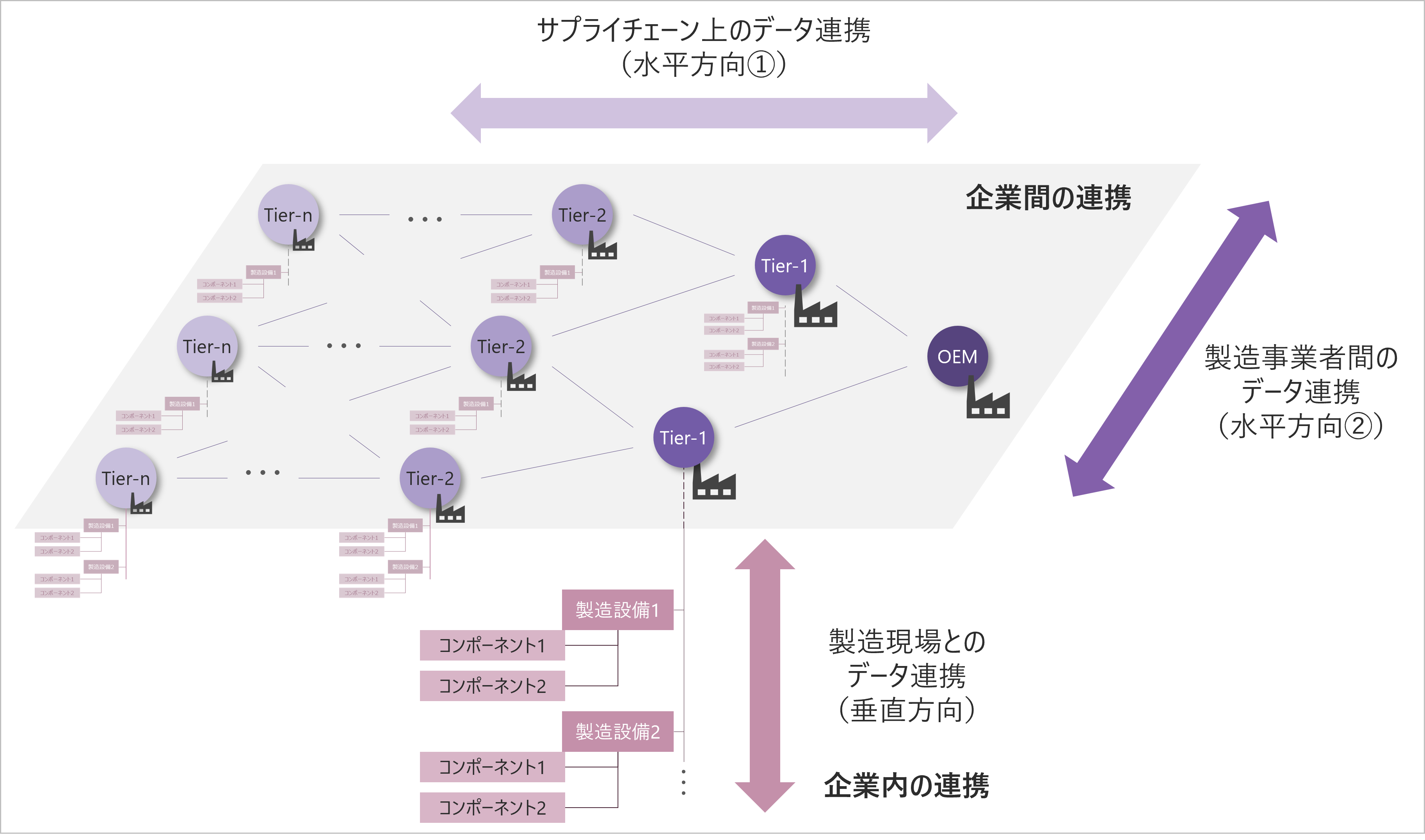 このことから、水平方向のデータ連携はサプライチェーン上の企業に限らず、時には競合となるような同種の製造事業者を含む企業間の連携を指すものと考える。製造設備の対応可能品目や空き稼働の情報が企業間で共有された状態で、ある企業の製造委託の要望に対して対応可能な企業・設備が臨機応変に応じられるような企業間の情報連携(水平方向)に加え、委託側の企業が受託側の企業の製造設備を遠隔的に操作・監視するといった製造現場との情報連携(垂直方向)が必要となる事例も検討される(図2)。
