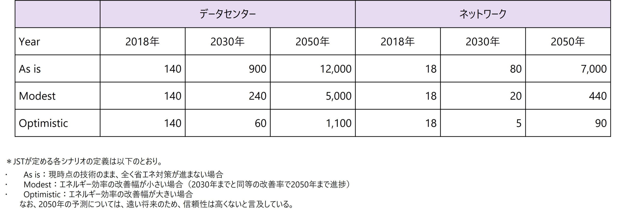 先述のとおり、DXはカーボンニュートラル実現に不可欠であるが、DXの進展によりIoTデバイスやAI需要の増加に比例する形で、データ処理に必要な電力消費量の増加が懸念される。例えば、国立研究開発法人 科学技術振興機構(JST)によれば、国内のデータセンターおよびネットワークの電力消費量は今後も増加する見込みである(表1)。