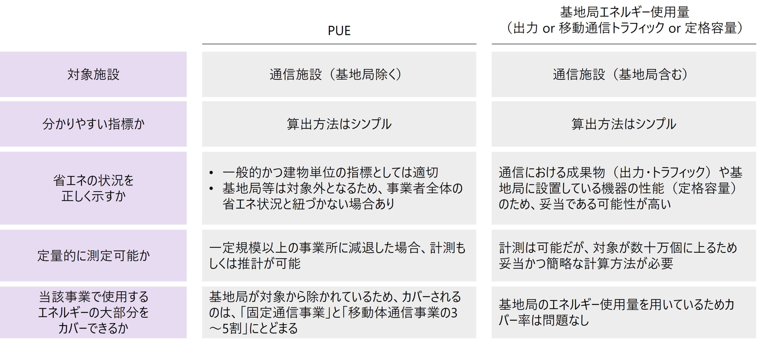 さらに従前よりネットワークセンター業への適用も検討が進められている。経済産業省公開の最新資料によれば、ベンチマーク指標については前述のPUEと基地局エネルギー使用量の2つが候補として挙げられている。主な違いは対象に基地局を含むか含まないかという点で、それぞれに省エネ状況の可視化精度や計測方法などにおいてメリット・デメリットがある(図1)。