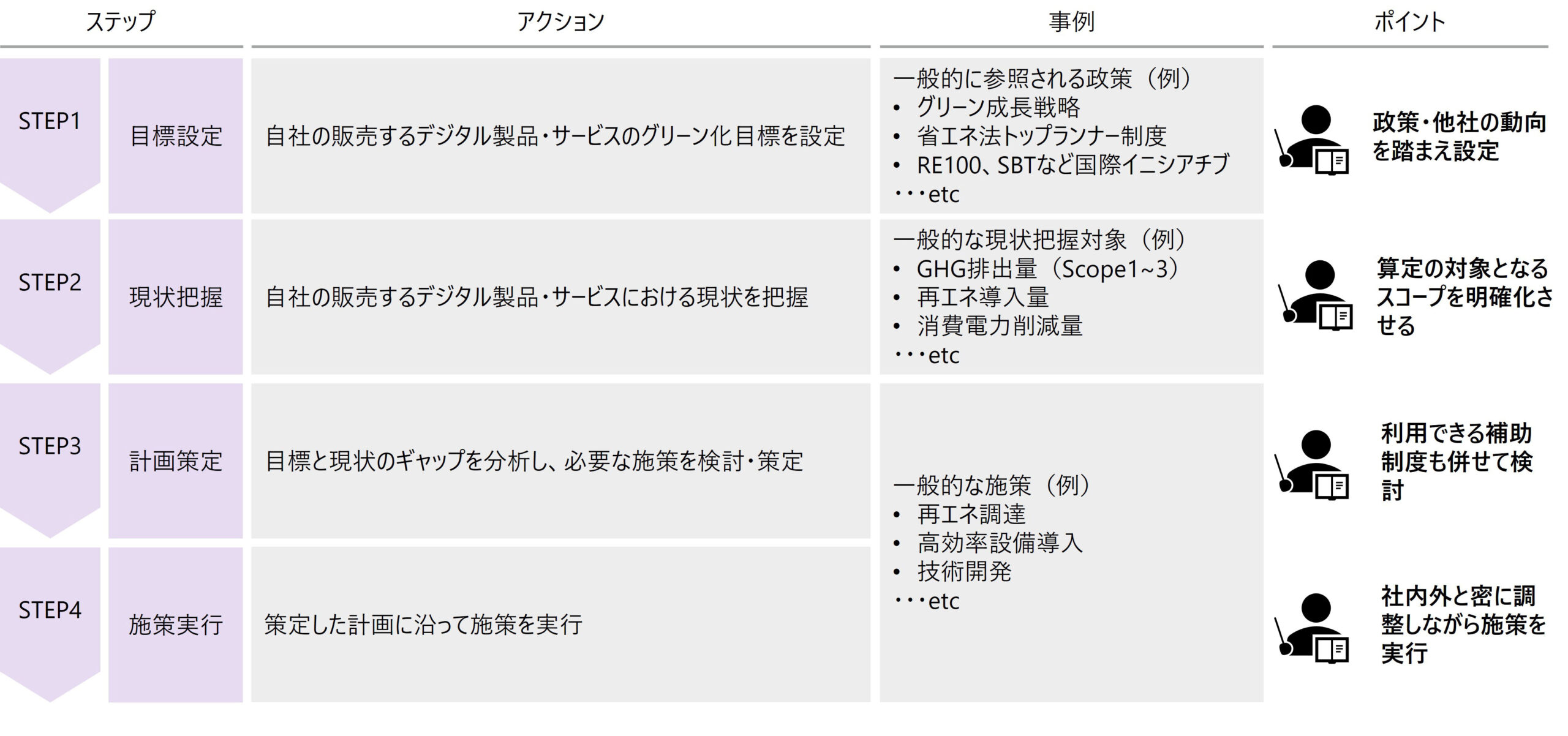 デジタル産業のグリーンofデジタル実現に向けては、大きく4つのステップでアプローチが必要になる(図2)。