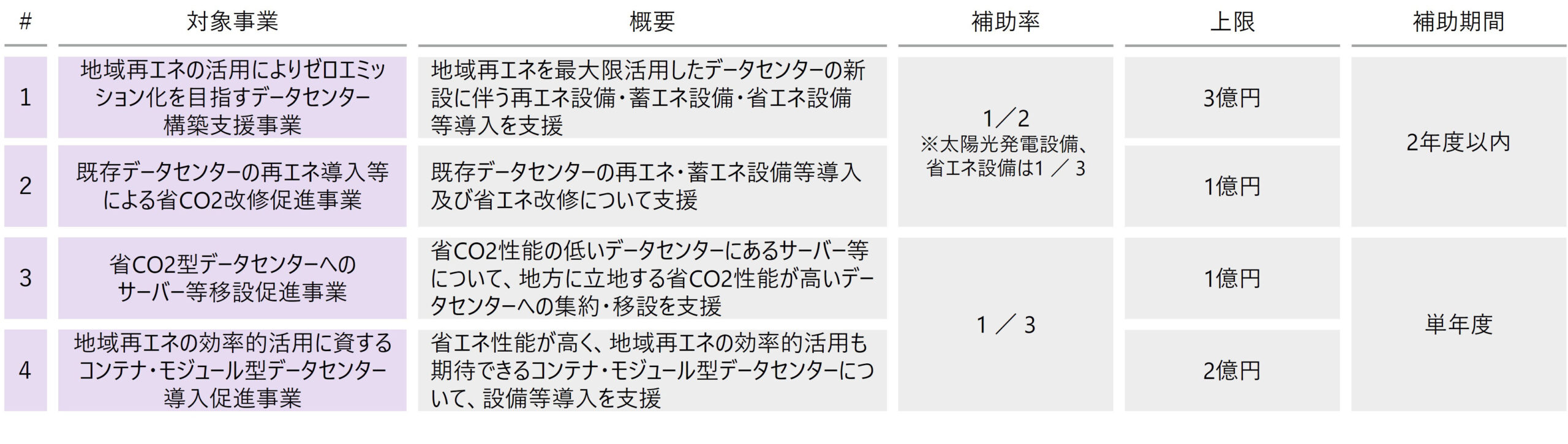 - 一般社団法人地域循環共生社会連携協会「二酸化炭素排出抑制対策事業費補助金(データセンターのゼロエミッション化・レジリエンス強化促進事業)説明資料」[4]を基に当社作成