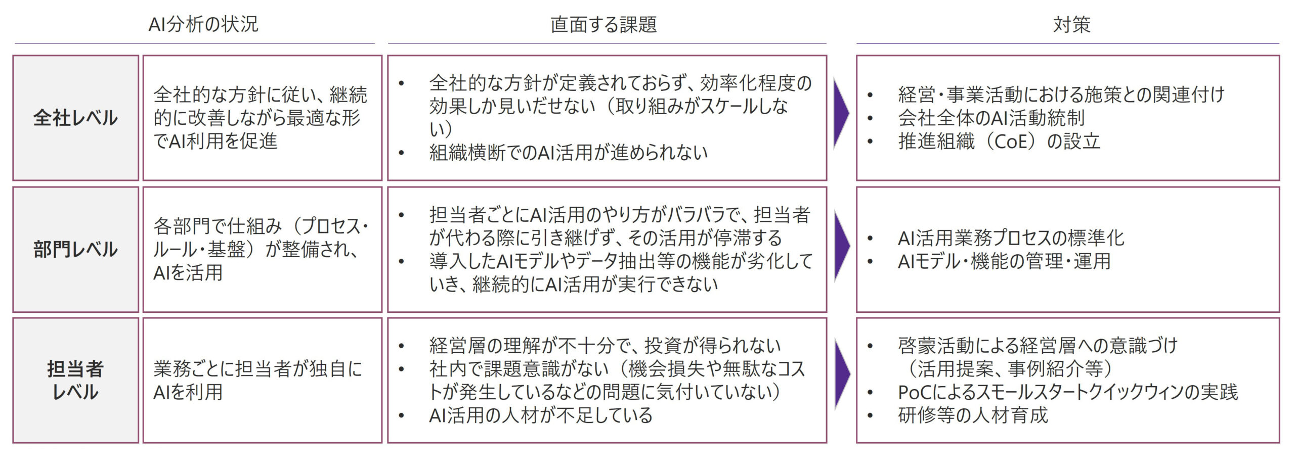 AI活用において直面する課題は、その成熟度により異なってくる。各成熟度レベルでのAI活用の状況と直面する主な課題と対策を示す。