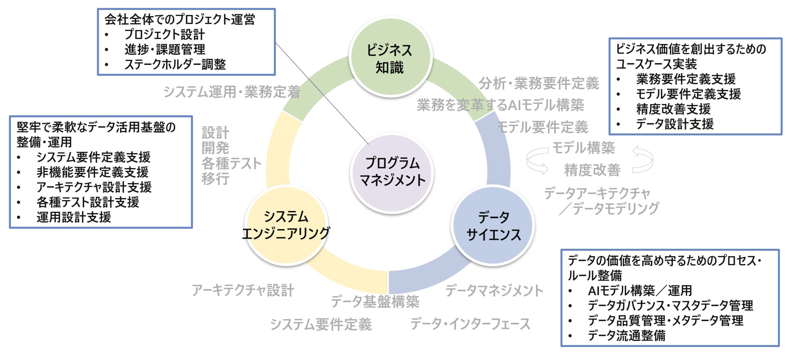 データの価値を高め守るためのプロセス・ルールを整備するスキル。要件に応じたAIモデルの構築・運用とあわせて、データガバナンスや品質管理、メタデータ管理といったデータマネジメントに取り組んでいく。また、データ入手元からデータ活用基盤までのデータ流通整備といった維持管理を継続的に実行する。