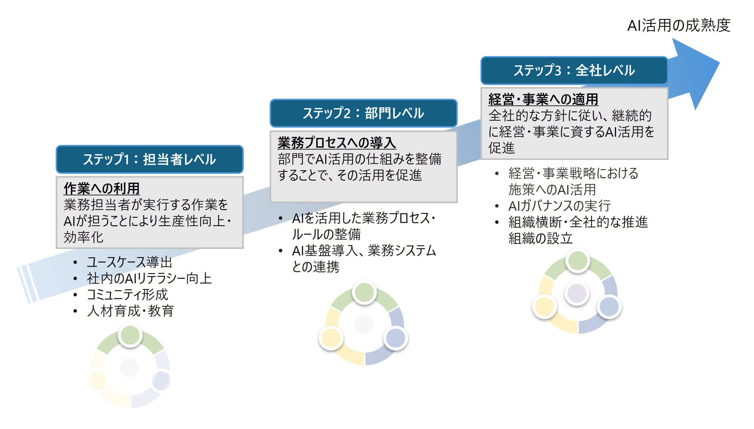 次にAIマネジメントのフレームワークを考慮して、AI活用の成熟度ごとの課題への対応に向けた取り組みを示す(図3)。AI活用の成熟度が低いうちは担当者ごとに個別対応していけばよいが、成熟度が高くなるにつれ、部門・全社的に取り組んでいく必要がある。