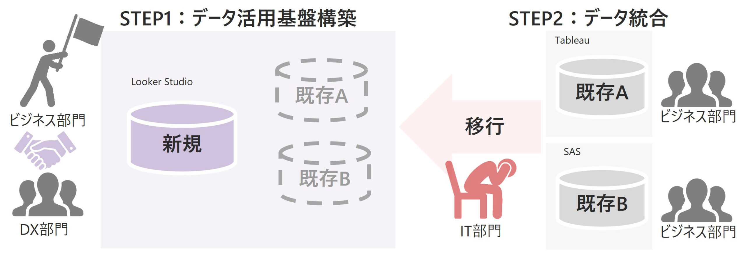 前章で説明した通り、新規データ活用業務はビジネス視点での推進力が強く、徐々に扱うデータの範囲が拡大していく性質がある。一方で、既存データ活用業務はビジネス視点での推進力が弱く、システムのあるべき姿を実現するためにITグランドデザインに沿ったシステム移行といったIT視点での後押しが必要となる。