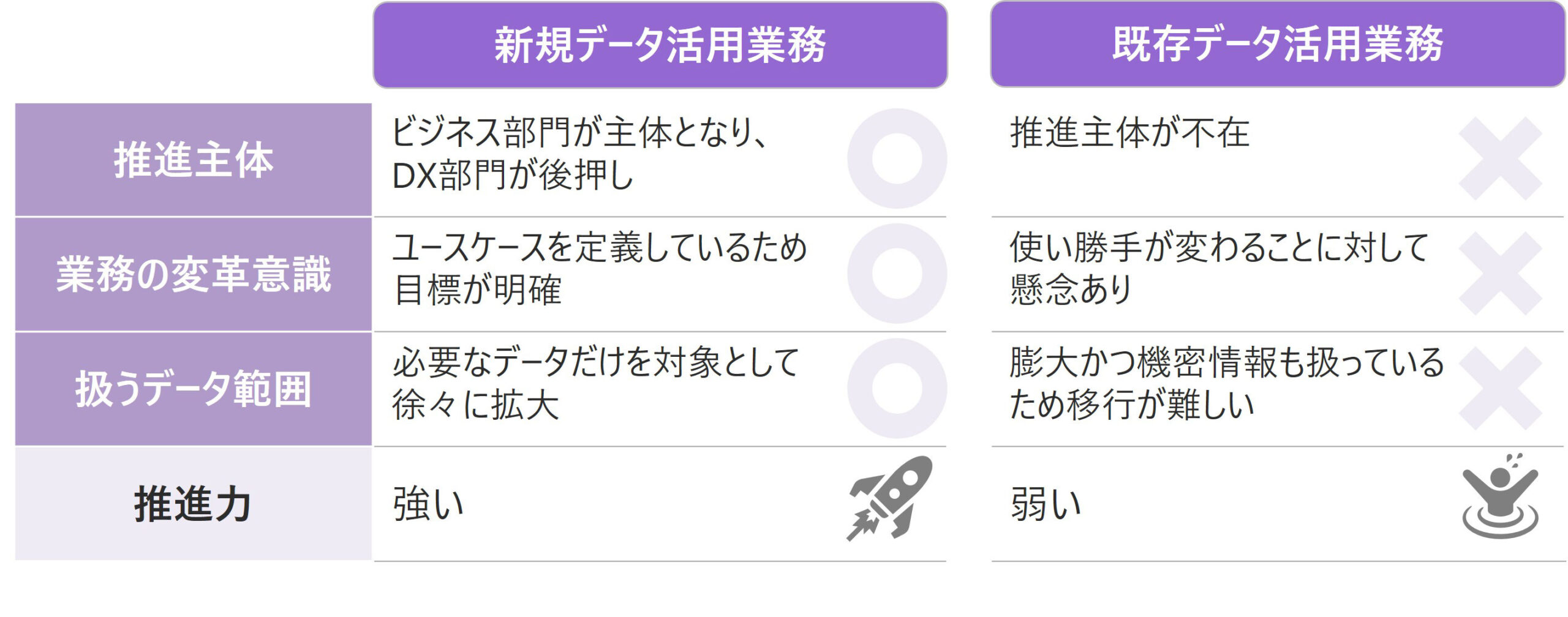 個社の状況により差異はあるだろうが、取り扱うデータが新規か既存かによってビジネス視点での推進力は異なる傾向があり、一般的に新規データ活用業務はビジネス視点での推進力が強く、既存データ活用業務では弱まる。上記3要素の観点から、理由を示す。