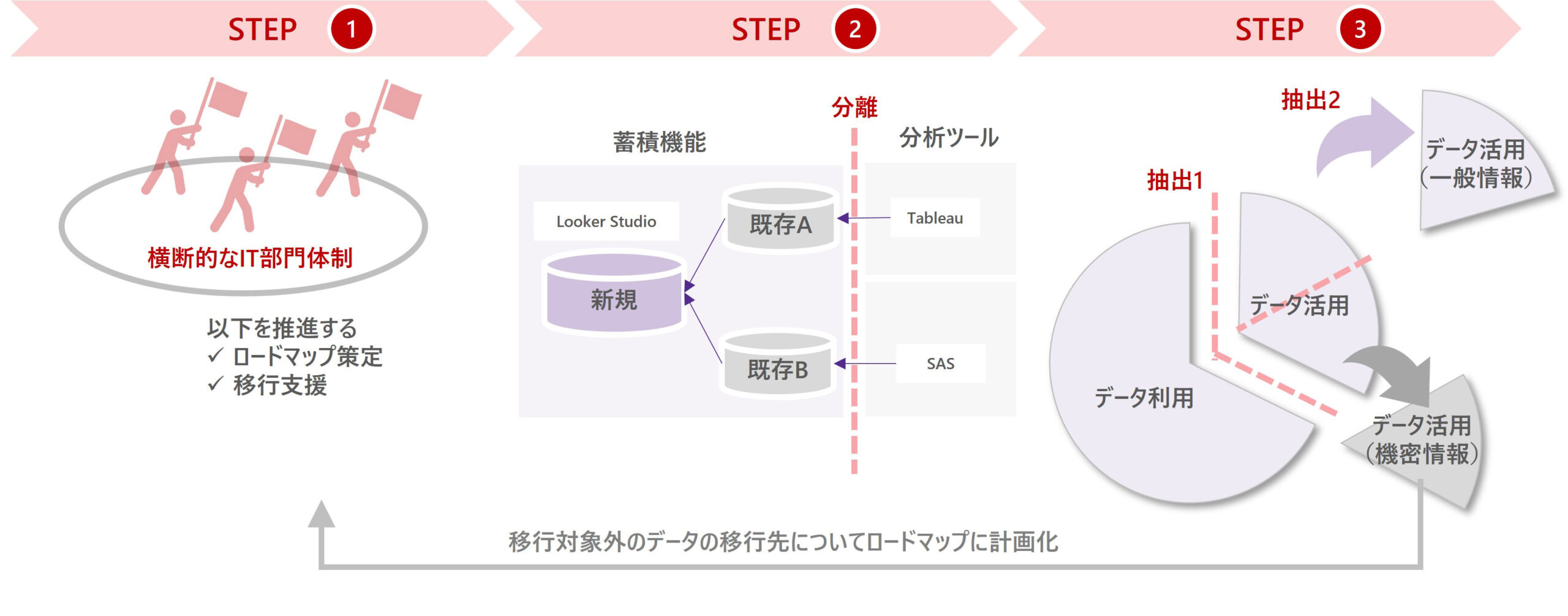 3つのSTEPを設定し、「推進主体」「業務の変革意識」「扱うデータ範囲」の要素における課題を順番に抽出して解決の方向性を検討した。