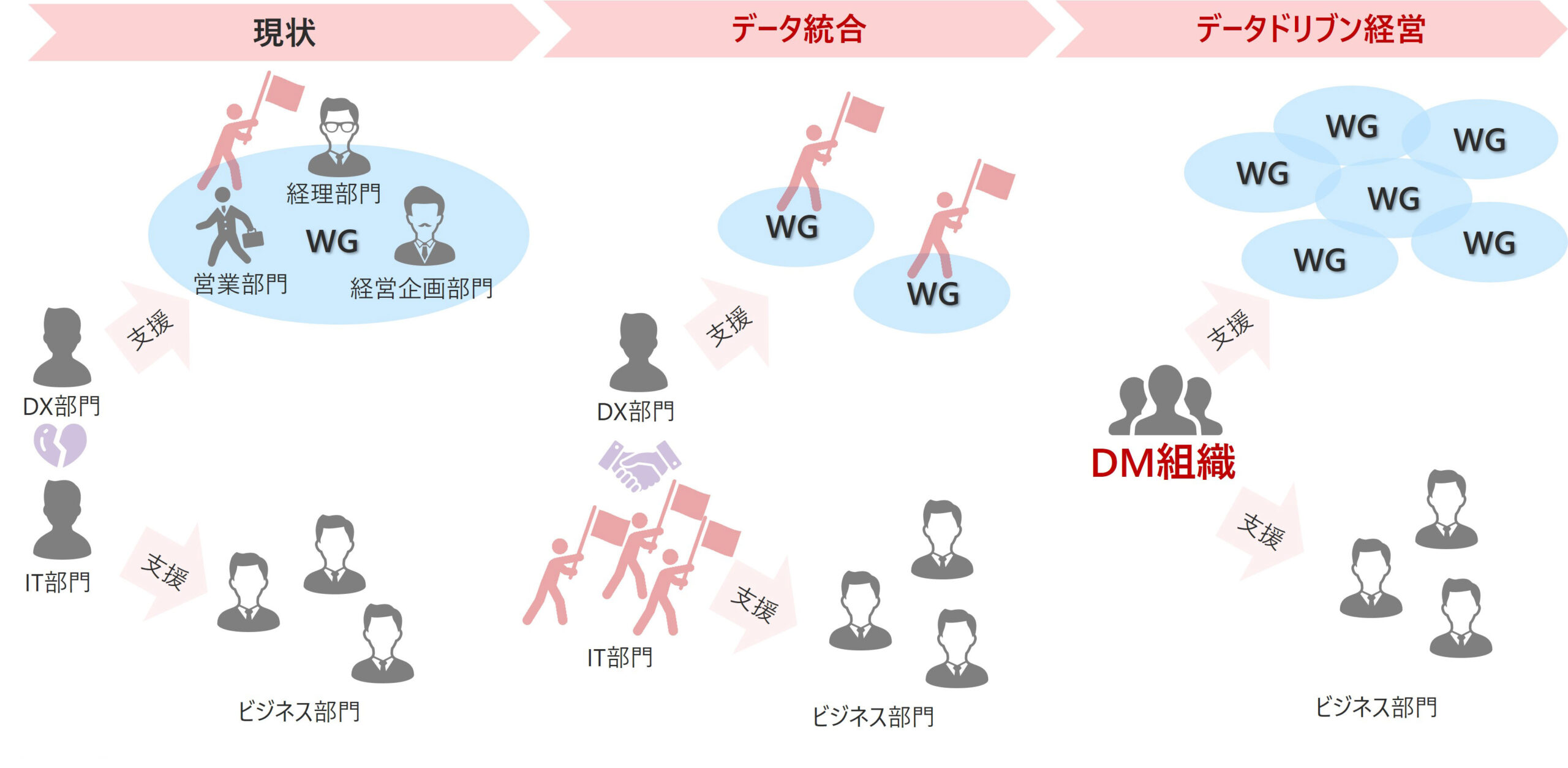 データドリブン経営を目指してデータマネジメントを推進していく体制として、データマネジメント組織(DM組織)がある。これはビジネス担当者とIT担当者から構成することで、ビジネスおよびIT双方の視点で各WGをマネジメントする仕組みである。DM組織は、データの利用方法や方針について最終的な決定を行う「データオーナー」、データの構造や設計を担当し技術的な統括を行う「データアーキテクト」、ビジネス面で担当者に寄り添いデータの利用支援を行う「コンシェルジュ」の最低3つの役割から構成される。