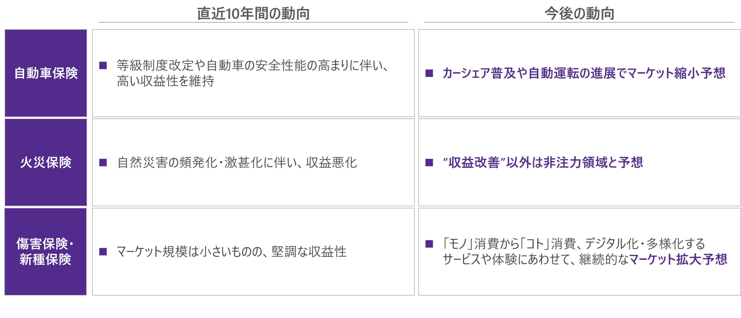 この1~2年は物価上昇や“リベンジドライブ”の影響等により収益性低下が見られるものの、直近10 年という単位で見ると等級制度改定やその後の継続的な値上げ、さらに自動車の安全性能が高まってきたことに伴い高い収益性を維持してきた。ただ今後に関しては、自家用乗用車の世帯あたり保有台数は減少傾向が続いている一方で、カーシェアリングサービスは広がっていること、さらには自動運転に関する技術の進展なども見据えると、個人分野の自動車保険マーケットは縮小が予想される。