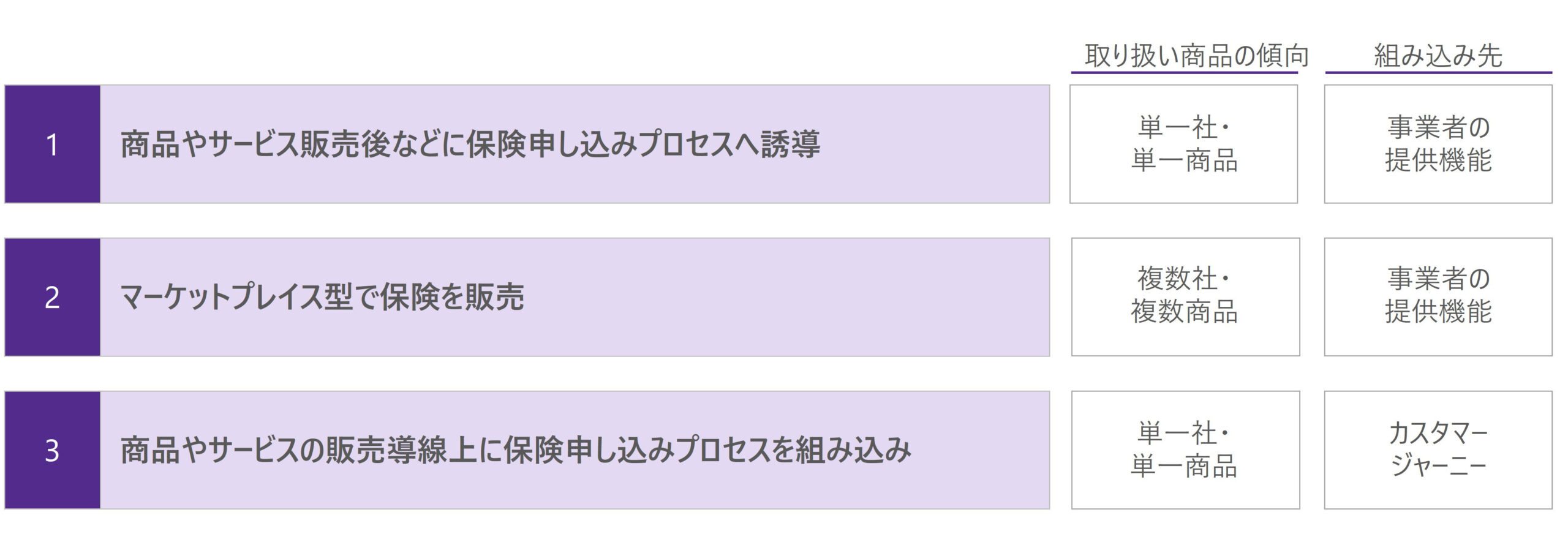 エンベデッド・インシュアランスの3類型のうち、1番目の類型として紹介したのが左下だ。1つの保険商品販売プロセスが事業者の提供機能として組み込まれているというところから始まり、2番目の類型であるマーケットプレイス型での複数種類の保険販売、そして3番目に紹介した購買導線上に保険申し込みプロセスを組み込む形へそれぞれ変遷してきた。