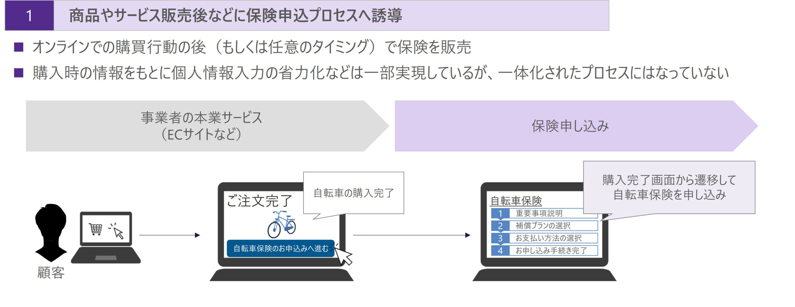 1つ目は顧客の購買行動と近いところで損害保険を販売するといった、従来からの主流モデルをオンライン上で行うものだ。オンライン上で自転車を購入するケースを例に挙げて説明しよう。まず顧客が事業者のECサイトで商品を購入し、注文が完了した後に自転車保険の申し込みに進むといったフローが提供される。これによりECサイトで入力した個人情報がそのまま保険の申し込み画面にも引き継がれ、入力を省略できるなど顧客へのメリットがある。ただし購入完了後の追加ステップとなるためプロセスとしては分断されており、商品購入と保険申し込みが一体化してないというのがこの類型の特徴だ。