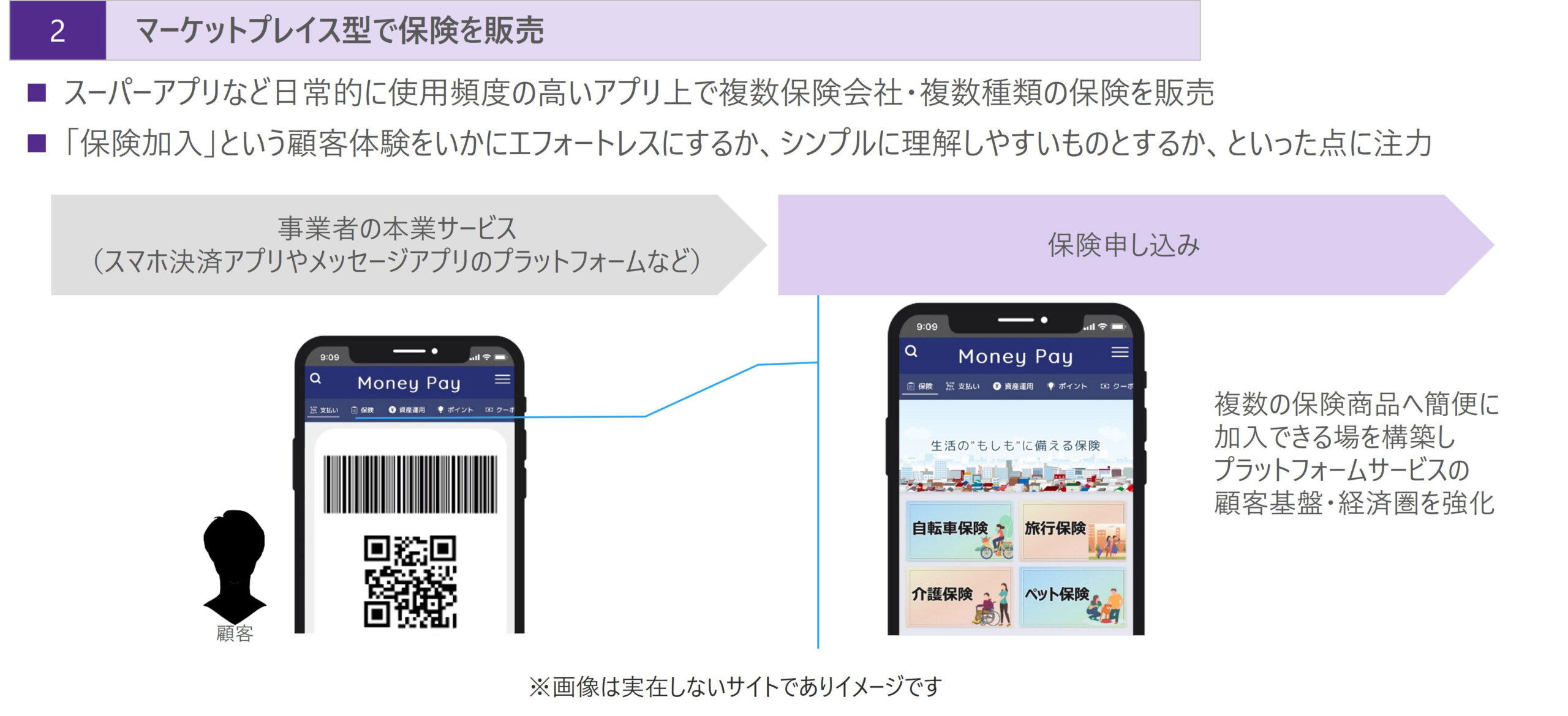 2つ目は、いわゆるスーパーアプリなどと言われる日常的に使用頻度の高いアプリ上で複数の保険商品を売っていくマーケットプレイス型である(図4)。スマホ決済アプリを例に挙げると、メインの機能は決済だが、同時にポイントを獲得したりクーポンを管理できたり、関連するさまざまな機能を備えている。その1つとして保険もラインナップされており、アプリ内で自転車保険やペット保険などさまざまな保険が販売されていて、手軽に加入できる場が提供されている。日常的に使うスマホアプリから保険の申し込みが簡便かつ気軽にでき、複数の保険商品を幅広に扱っている点がポイントとなる。その一方、顧客の購買行動と直接的に紐づいているものではないという特徴もあると言える。