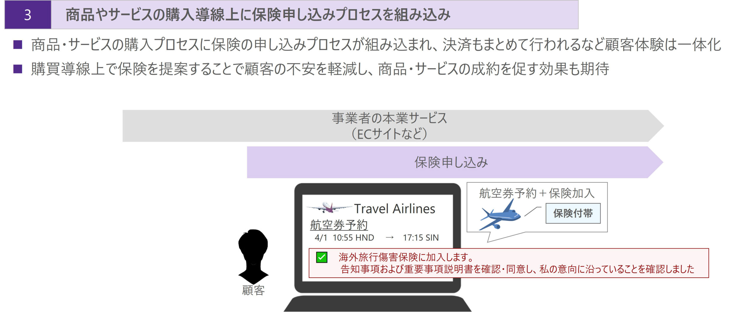 例えば航空券の予約サイトにおいて、購買の導線上に「海外旅行保険申し込み」の案内がチェックボックスのような形で入っており、航空券の予約と一緒に保険の申し込みもできるのが3番目の類型だ。保険の申し込みプロセスが購買導線に自然に溶け込んでいるため、商品購入と分断されることなく簡易かつ効率的に保険加入を促せる。さらに保険があることで顧客の不安を軽減しながらサービスや物品そのものの購入を促すことができるなど、事業者側の本業サービスに対してもポジティブな効果が期待できる(図5)。