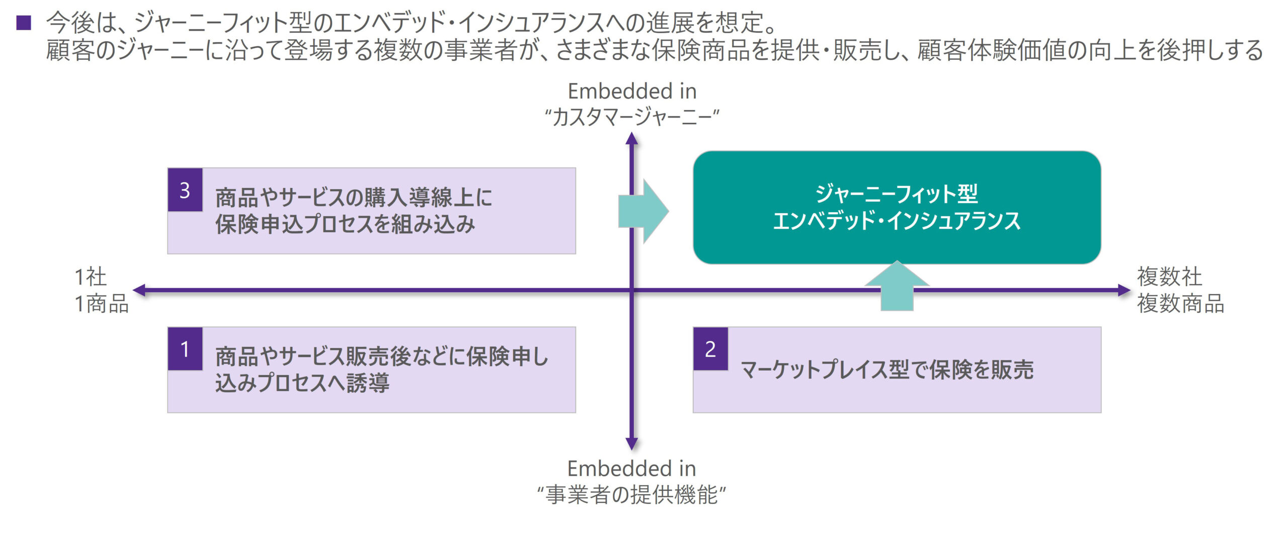 その上で今後エンベデッド・インシュアランスは、右上のホワイトスペースのところへ進展していくものと考える。右上に「ジャーニーフィット型エンベデッド・インシュアランス」と記載したが、これは顧客のジャーニーに合わせて複数の事業者がさまざまな保険商品を販売し、顧客のジャーニー上の体験の充実、価値の向上を後押ししていくという新しいエンベデッド・インシュアランスのあり方をイメージしている。