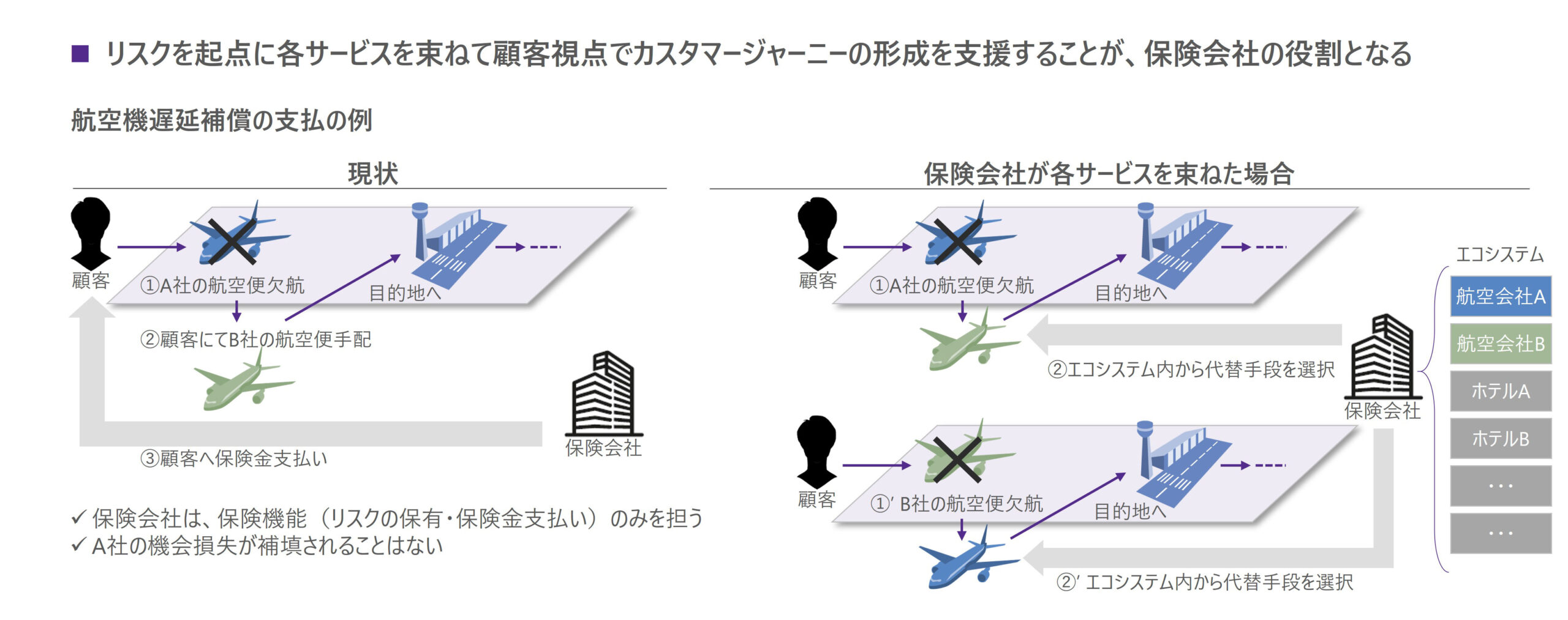図の左側の現状においては、例えばA社の航空便が欠航した際に顧客は別の手段で目的地に行く必要があるため、顧客自身で別の便を手配して目的地に辿り着く。この際の費用や損失は、保険金という形で保険会社から顧客に支払われる。この場合、顧客は再手配の手間をかけて結果的に目的地には到着できるが、航空会社A社から見ると単なる機会損失という結果になる。