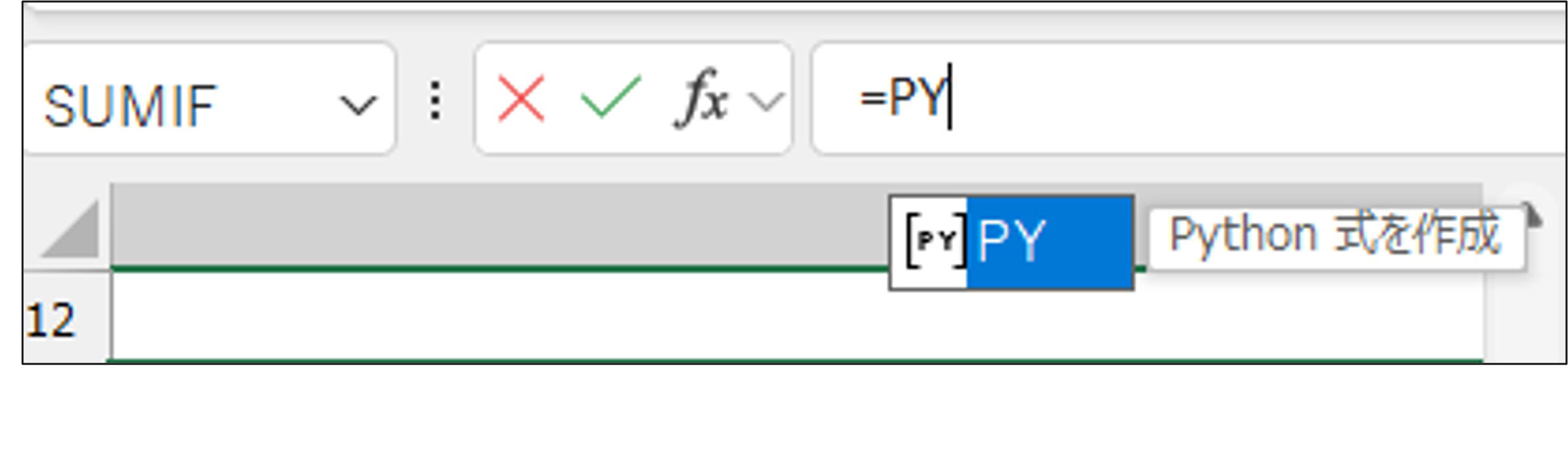 まず、Excelの「数式」タブにある「Pythonの挿入」ボタンをクリックする(図1)。これにより、選択したセルにPythonのコードを入力できるようになる。または、セルに=PYと入力してPythonの関数を有効にすることもできる(図2)(操作方法の説明は[3]を参考に記載)。