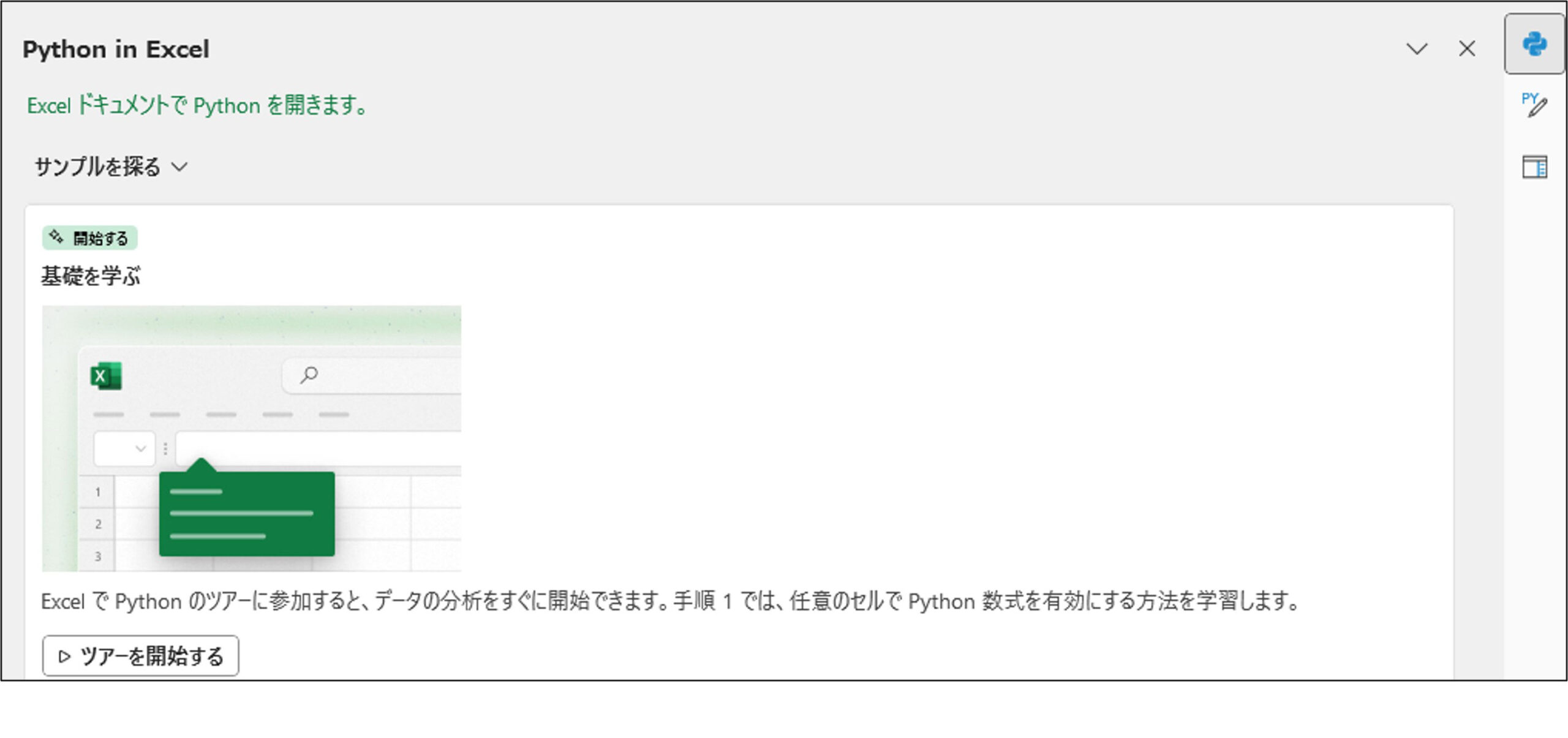 操作方法については、Excel内のチュートリアルも豊富である。チュートリアルには、Python in Excelの操作方法の基礎からpandasによる記述統計の出力や各種グラフのサンプル、線形回帰での活用例などが豊富に掲載されている(図5)。
