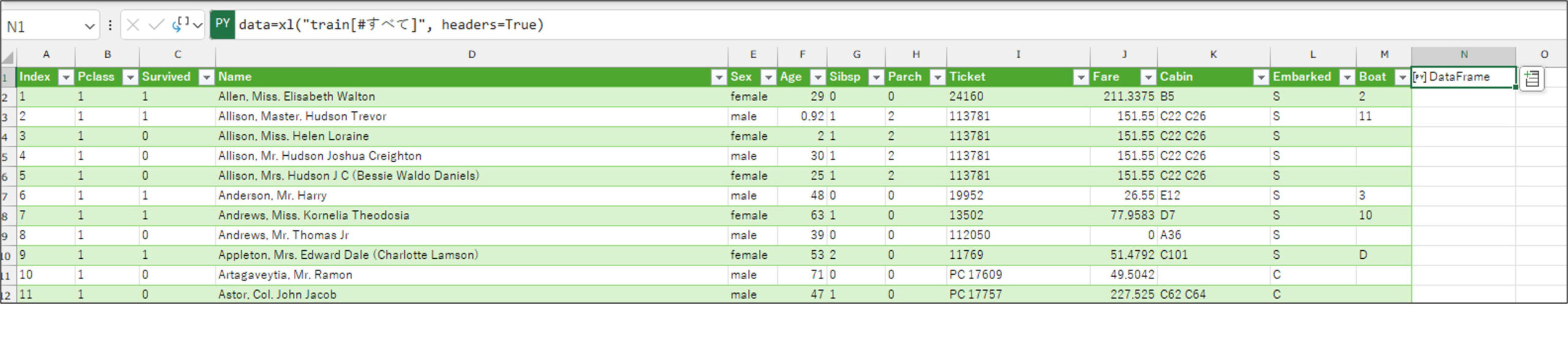 以下の例では、まずPower Queryでデータをクレンジングしてtrainという名前のテーブルに読み込み、それをN1セルでデータフレームdataに読み込んでいる。また前述の通り、pandasをインポートするコードを書くことなく、即座にデータフレームに読み込んでいることが見て取れる。