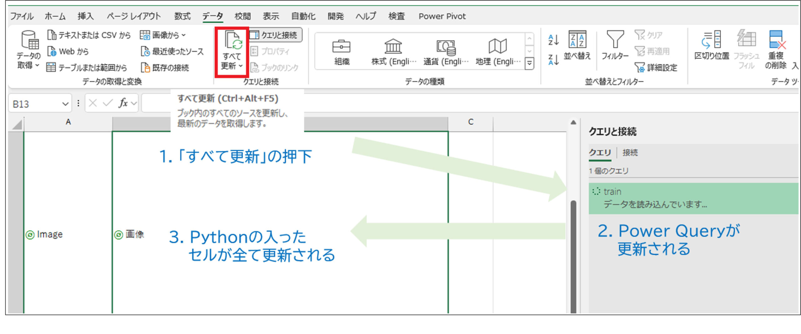 「すべて更新」を押下することで、Power QueryからPython in Excelまで全て一連の処理が更新される。これにより、データにアップデートがあった際にも対応できる(図8)。