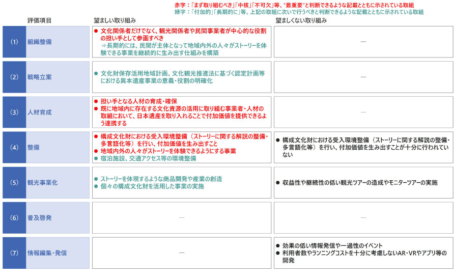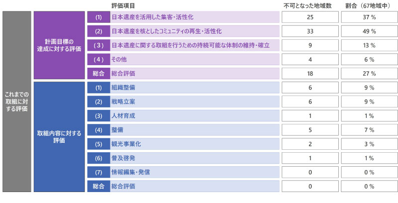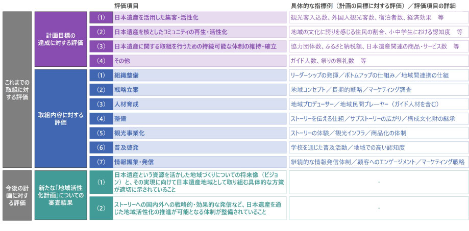 次に、「取り組み内容に対する評価」については、平成29年度日本遺産フォローアップ委員会[5]において枠組みが議論されており、地域活性化計画の内容に照らし合わせて、(1)組織整備、(2)戦略立案、(3)人材育成、(4)整備、(5)環境事業化、(6)普及啓発、(7)情報編集・発信という7つの評価項目の観点が整理されている。その後、日本遺産フォローアップ委員会や日本遺産審査・評価委員会の議論の中で細かい評価観点のブラッシュアップは見られるが、大きな構造は変わっていない。なお、これら評価対象期間の取り組みの評価については、各項目と計画目標と取り組み内容それぞれの総合評価について、「可・不可」という定量的な評価が示されている。