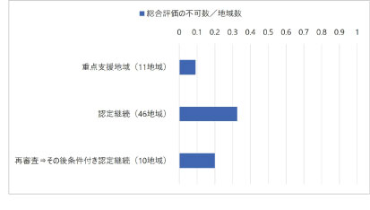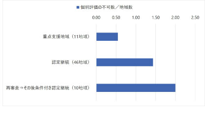 一方で、図4を見ると、総合評価不可となった平均項目数は、認定継続となった46地域(0.33)が再審査地域(0.20)よりも多い。