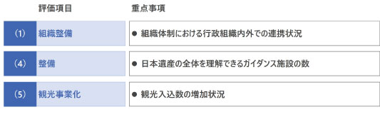 一方で、今後の計画に対する評価としては、『「日本遺産(Japan Heritage)」認定・評価実施要項』第12条(2)、(3)[6]に示される下記の観点を用いて評価が行われているようである。