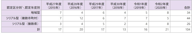 また、認定にあたっては、単一の市町村から構成される地域型と、複数の市町村から構成されるシリアル型の二つの区分がある。34件(全体の33%)が地域型、70件(同67%)がシリアル型となっており、このうち、26件(同25%)が複数県にまたがるストーリーとして認定を受けている(表1)。