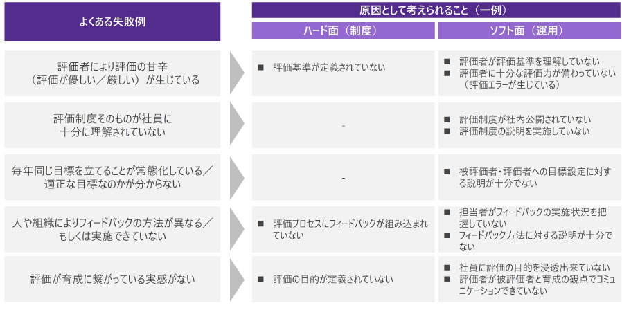 読者の中にも同じような悩みを抱えている方がいるかもしれない。では、このような失敗がなぜ起こってしまうのか。原因を整理すると、評価制度そのものでなく運用面に問題が生じているケースが多いことに気付く。例えば評価者により評価の甘辛が生じている場合、制度として評価基準が定義されていないケースもあるが、定義された評価基準を評価者が十分に理解できていない、評価基準は理解しているが評価力が備わっておらず評価エラー*が生じている等という運用に原因のあるケースの方が多い。