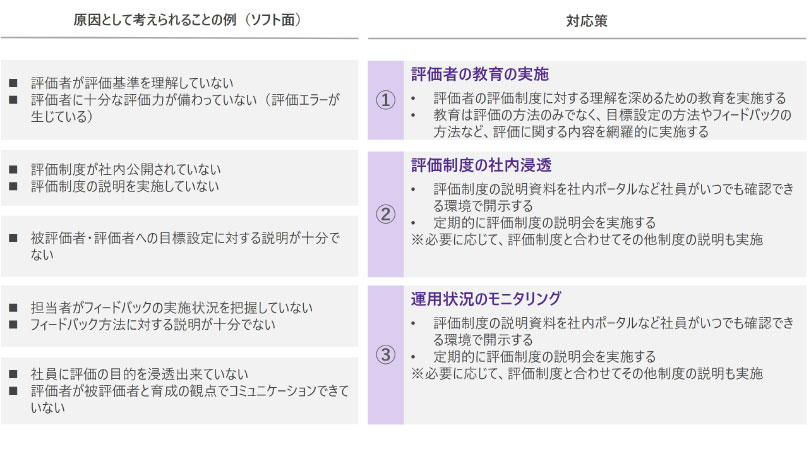 もちろん、制度が十分に検討されていない、制度に矛盾が生じているということもゼロではなく、時には評価制度そのものを見直す必要があるケースもあるが、本稿ではソフト面(運用)での対策に焦点を絞って解説する。