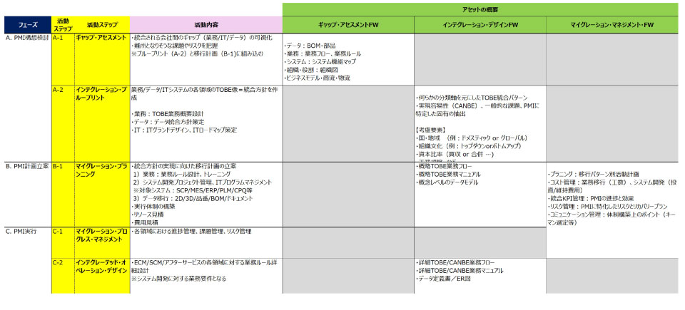 PMIはA:PMI構想検討、B:PMI計画立案、C:PMI実行の三つの段階に分けて進めていく(表1)。