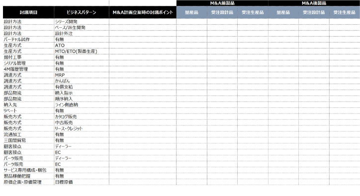 例えば、同じ組織名でも役割が違っていたり、同じ組織・役割でも業務量が異なっていたりする。同じパッケージシステムでも標準機能の使用範囲が合わなかったり、アドオン開発していたりする。このような違いを洗い出し、PMI計画立案・実行時の論点を明確にする。筆者らが経験した一例としては、類似する製品を開発・生産・販売している二社間のM&Aにおいて、購買部門の業務機能は同じであったが、人員数や購買品目が大きく異なっていた。これはBOM構造の違いに起因するもので、工場の広さの違いから部品倉庫に格納できる品目のサイズや量に制約があったほか、導入されていた生産設備の違いから組立・加工できる品目にも違いがあった。PMI方針検討ではBOMや取引先、取引条件の共有まではしないが、部門の役割・人数規模から類推することができる。